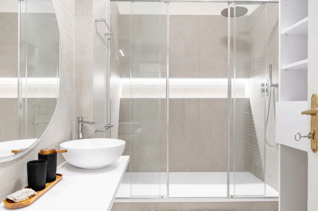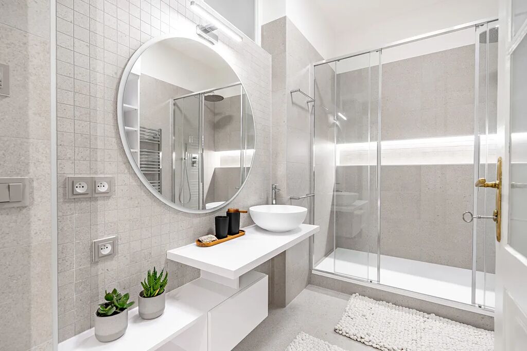 • luxusní koupelnu s designovými prvky, velkorysým sprchovým koutem a sestavou skříní a polic s místem na pračku i sušičku