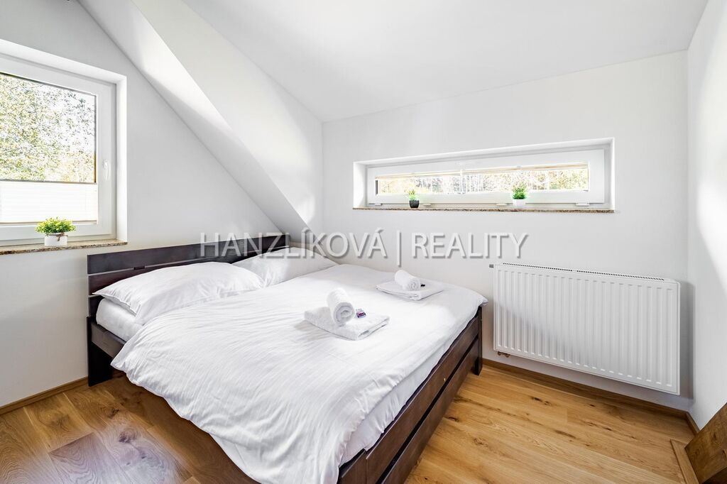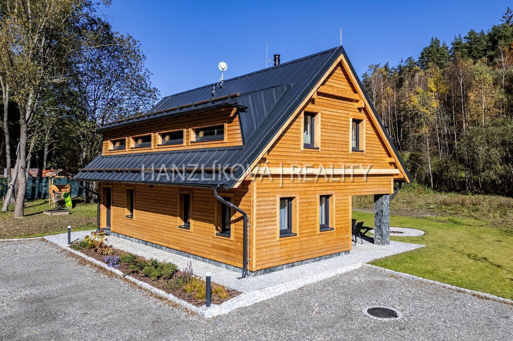 Dům je součástí komorního rekreačního areálu " Venkovské usedlosti Pernek" a byl zkolaudován v roce 2022. Dům stojí na vlastním pozemku o celkové výměře 1381 m2, disponuje užitnou plochou přes 156 m2 a je rozdělen na dvě obytná podlaží. V přízemí se nachází prostorná kuchyně s jídelnou a přímým vstupem na terasu, obývací pokoj s krbem, koupelna a technické zázemí. V podkroví najdete čtyři samostatné ložnice a další koupelnu s WC. Celkově nabízí pohodlné zázemí i pro větší rodinu či rekreační pronájmy. Dům je napojen na el. en. - má vlastní elektrokotel a bojler na ohřev vody, vytápění je podlahové, voda ze společné studny, každý dům má pak svou čističku pitné vody, odpad - septik na vyvážení. Dům byl postaven z kvalitních materiálů a zůstává plně vybaven.