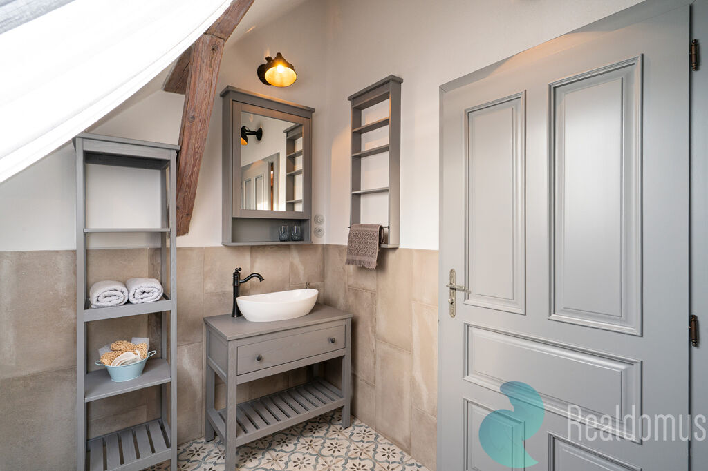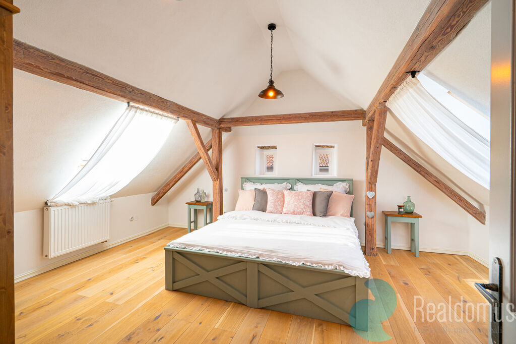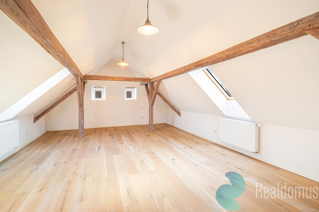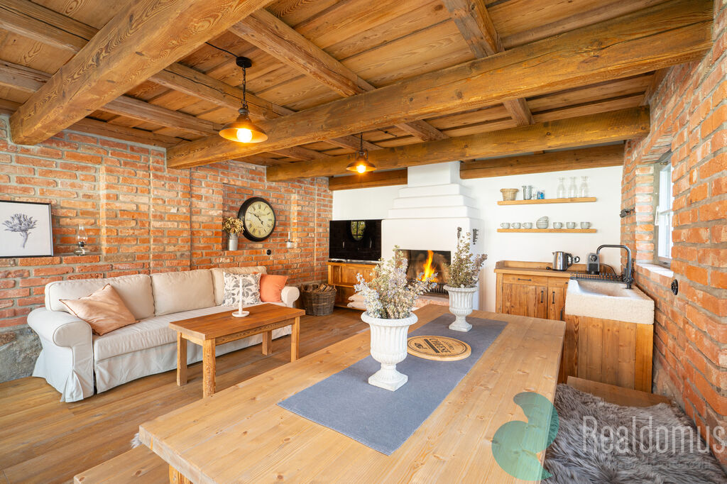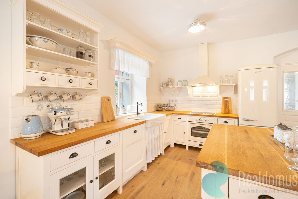 Za zdmi uzavřeného dvora objevíte svět, kde čas plyne pomaleji. V domě se nacházejí tři ložnice, dvě koupelny a prostorná obytná kuchyně, jejíž atmosféru dotvářejí kamna s pecí. Majitelé provedli velmi citlivou rekonstrukci, jejíž podstatou bylo použití tradičních prvků, jako jsou trasvápenné omítky, špaletová okna, dubové podlahy, porcelánové zásuvky a vypínače, ručně vyráběná italská svítidla či retro-sanita, díky nimž si dům uchoval svůj původní historický charakter. Každý detail působí jako malý umělecký šperk – od původního starého dřeva po kvalitní dlažby. Dům je navíc podsklepený a technicky připravený i pro moderní technologie, včetně chytrého ovládání vytápění.