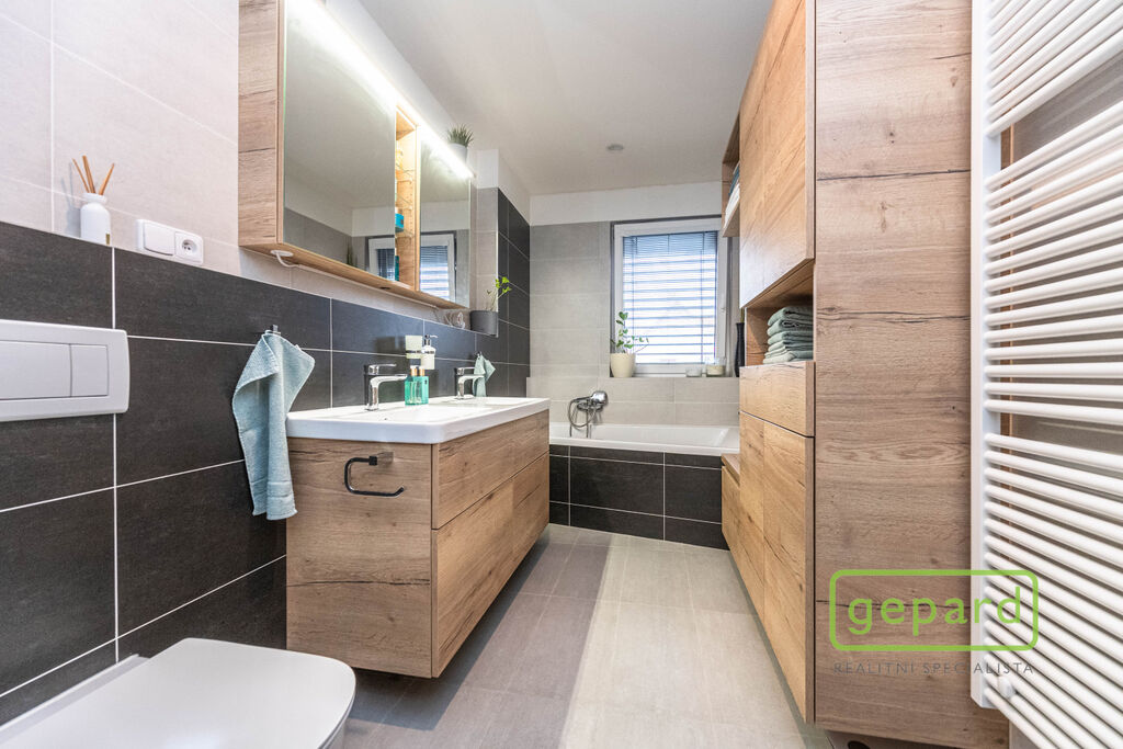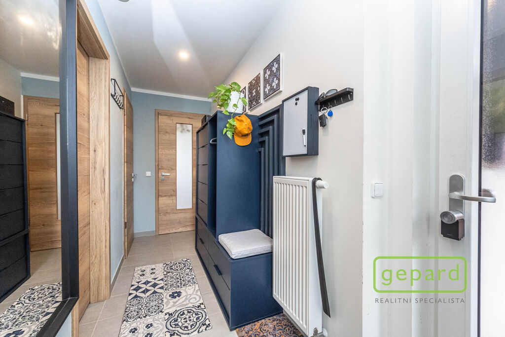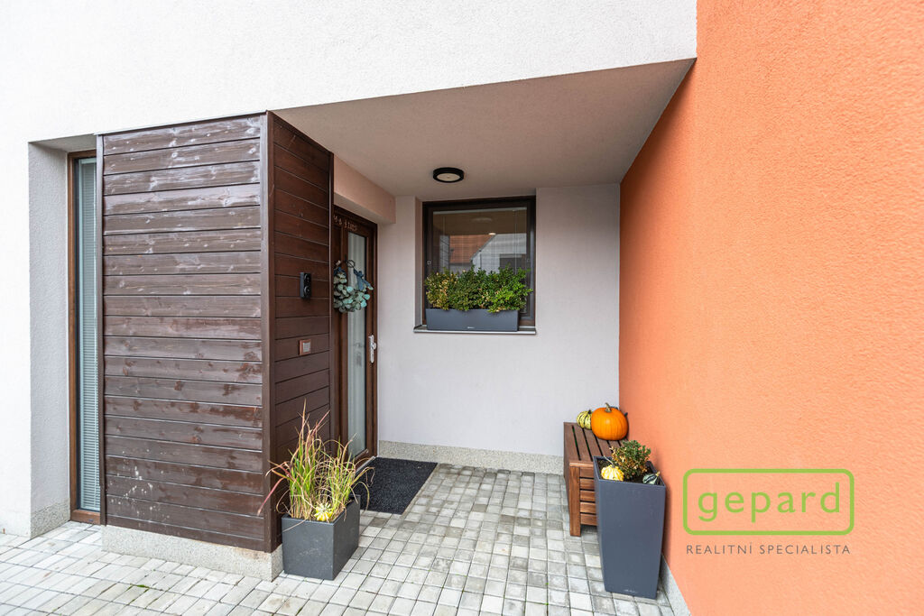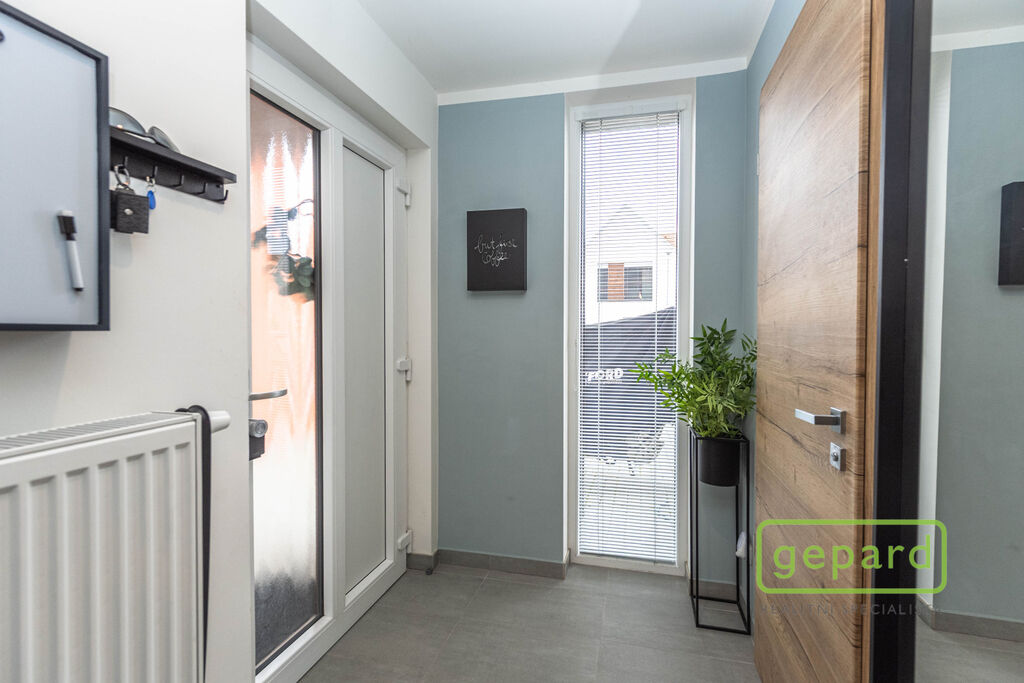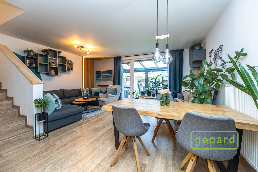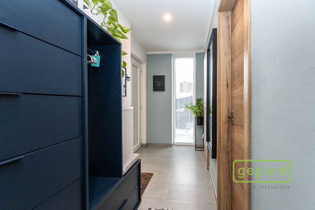 V přízemí je chodba (6,4 m2), prostorný obývací pokoj (26,83 m2) s kuchyní (7,16 m2) a se vstupem na zahradu a zastřešenou terasu. Kuchyně je kompletně vybavená spotřebiči (myčka, horkovzdušná trouba, mikrovlnná trouba, indukční varná deska, digestoř, kombinovaná lednice s mrazákem). Dál je v přízemí samostatné WC (2,16 m2), komora (4,1 m2) s místem pro kotel, pračku a sušičku a úložný prostor pod schody (2,82 m2). V patře jsou 3 ložnice (12,74, 10,24 a 9,35 m2), koupelna s vanou i sprchovým koutem (8,75 m2) a šatna (3,36 m2). V podkroví je možné využít další úložný prostor. Před domem je místo pro parkování 2 automobilů. Dům je nabízen částečně zařízený, zůstává zde kuchyňská linka včetně spotřebičů a nábytek na míru v koupelně a WC.