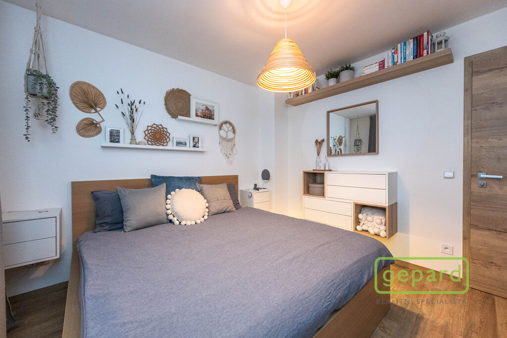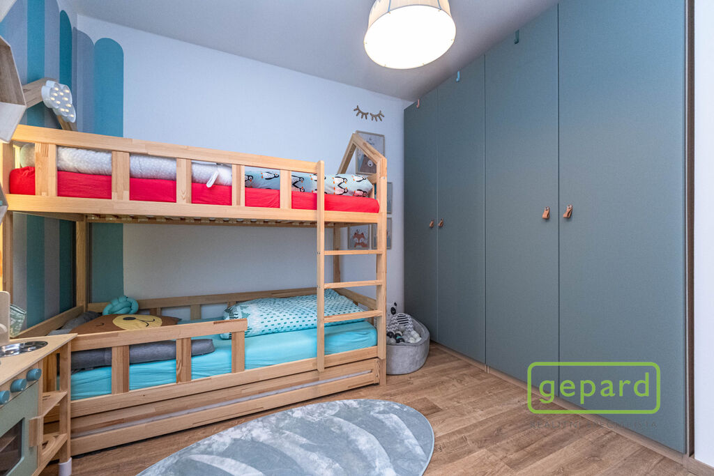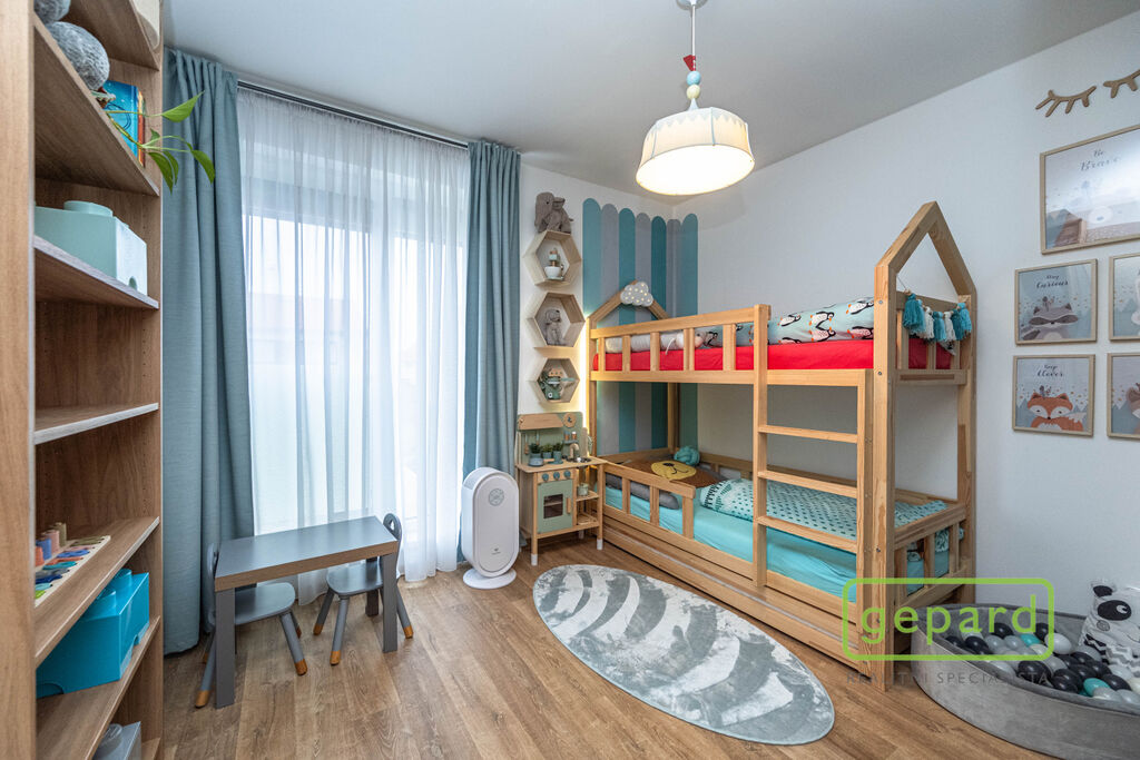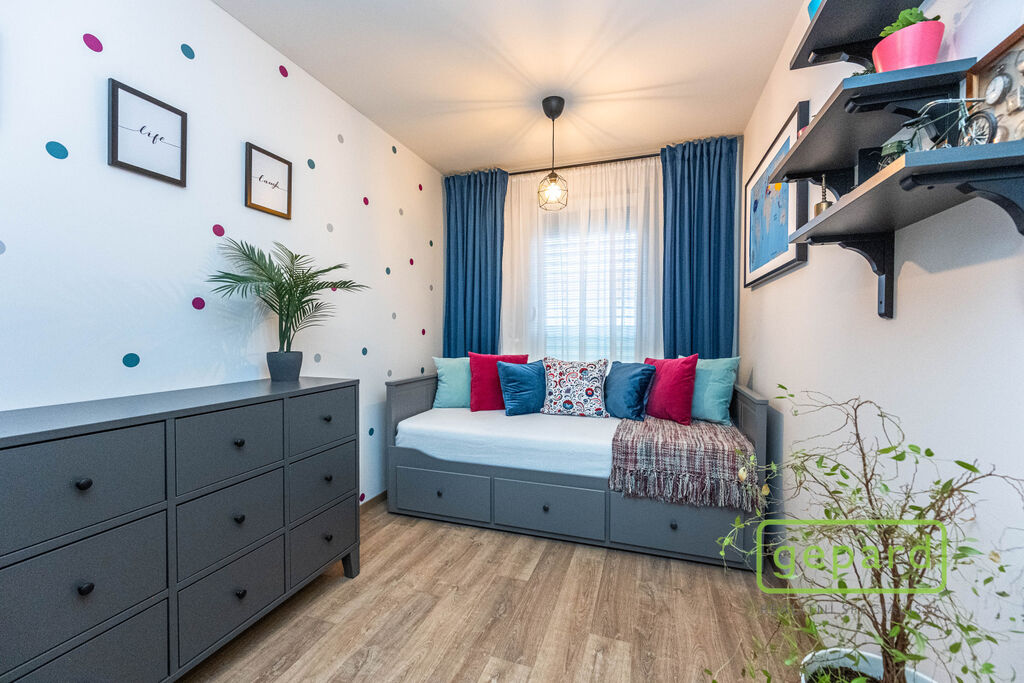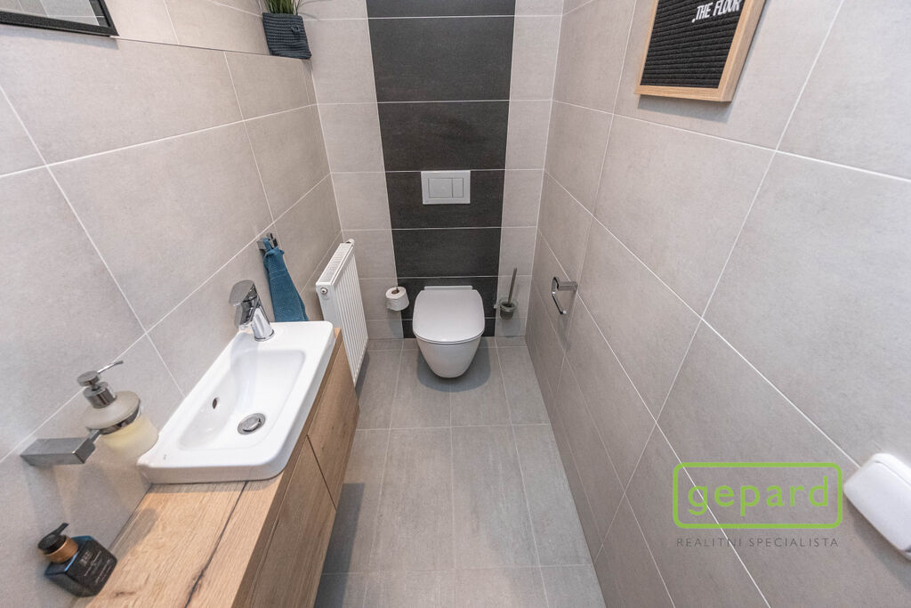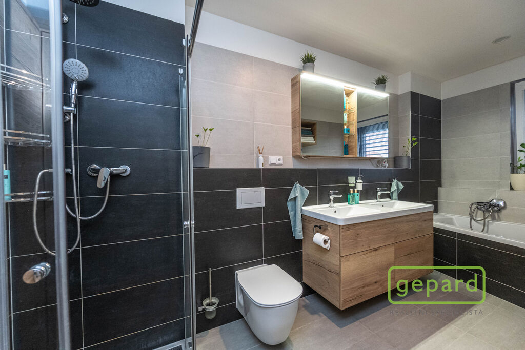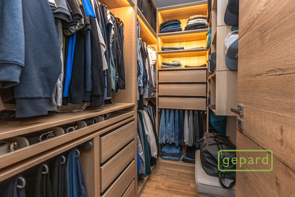 V přízemí je chodba (6,4 m2), prostorný obývací pokoj (26,83 m2) s kuchyní (7,16 m2) a se vstupem na zahradu a zastřešenou terasu. Kuchyně je kompletně vybavená spotřebiči (myčka, horkovzdušná trouba, mikrovlnná trouba, indukční varná deska, digestoř, kombinovaná lednice s mrazákem). Dál je v přízemí samostatné WC (2,16 m2), komora (4,1 m2) s místem pro kotel, pračku a sušičku a úložný prostor pod schody (2,82 m2). V patře jsou 3 ložnice (12,74, 10,24 a 9,35 m2), koupelna s vanou i sprchovým koutem (8,75 m2) a šatna (3,36 m2). V podkroví je možné využít další úložný prostor. Před domem je místo pro parkování 2 automobilů. Dům je nabízen částečně zařízený, zůstává zde kuchyňská linka včetně spotřebičů a nábytek na míru v koupelně a WC.