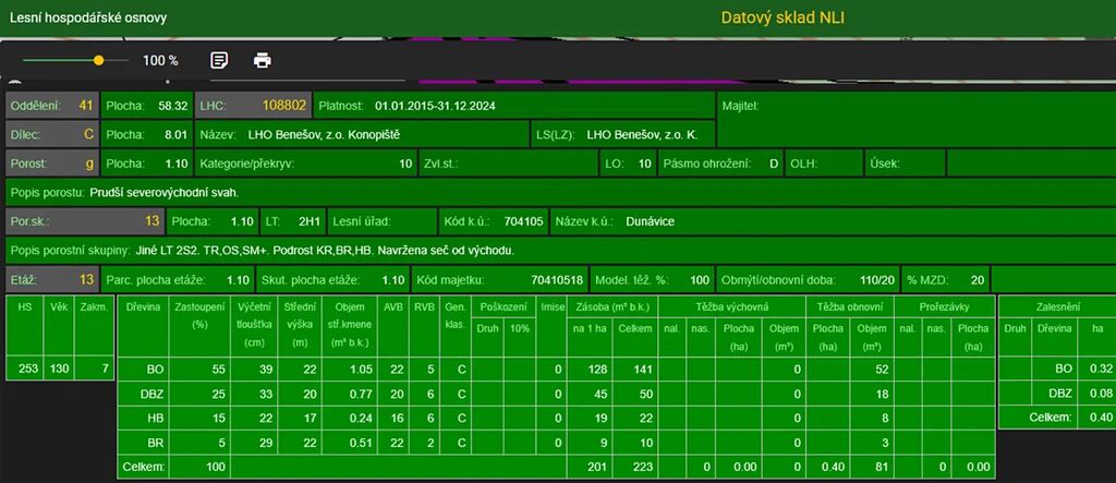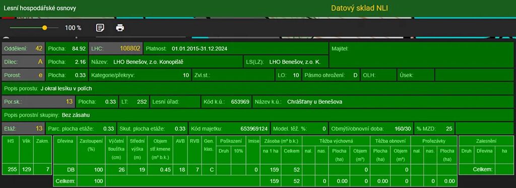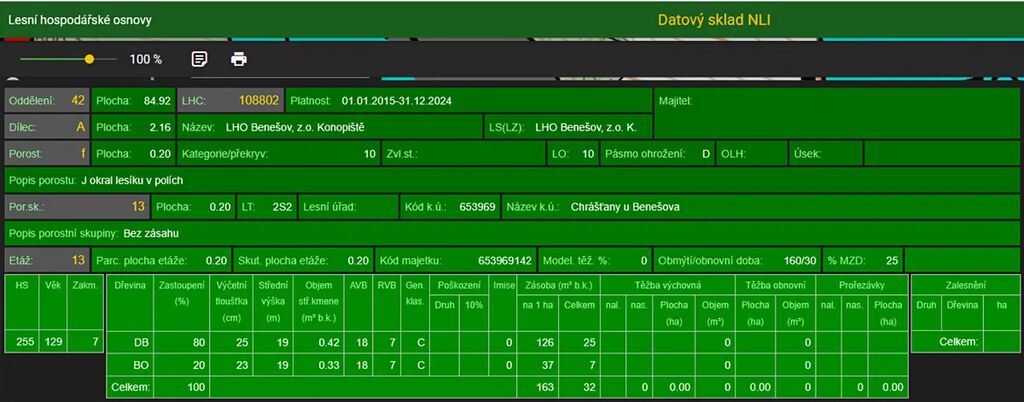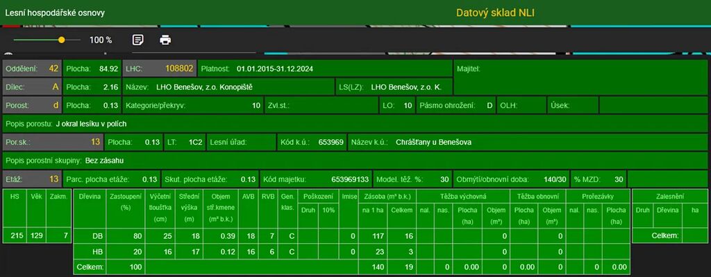 Jedná se o p.č. 106 vedená jako lesní pozemek o celkové výměře 11 078 m2, vlastníme podíl 3/8, tedy 4 154 m2.