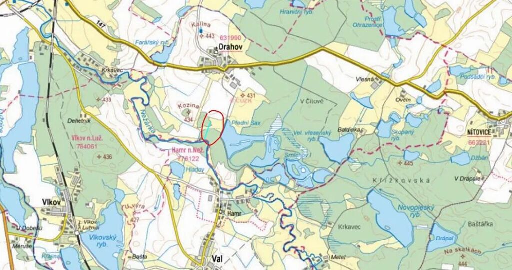 Jedná se o p.č. 828 vedená jako lesní pozemek o celkové výměře 2 349 m2, vlastníme podíl 3/4 tudíž 1 762 m2.