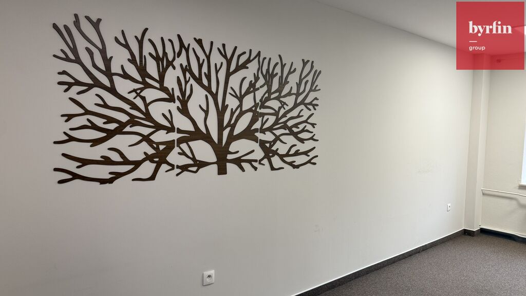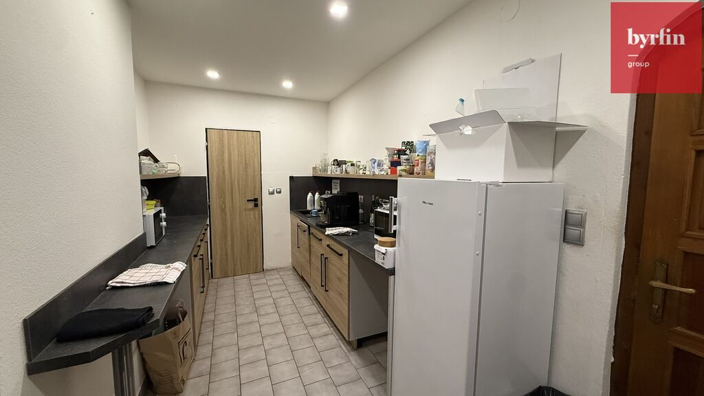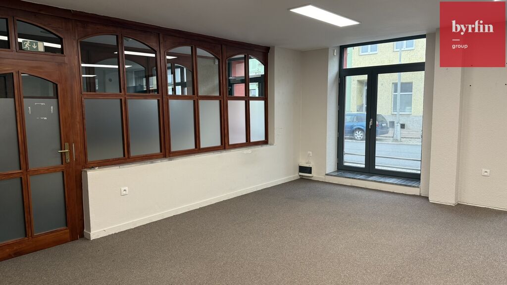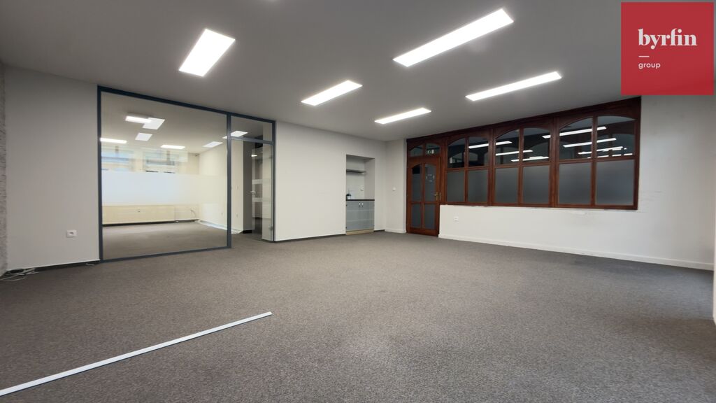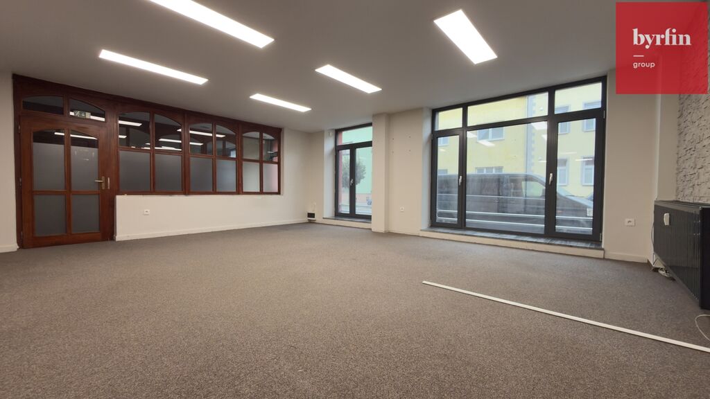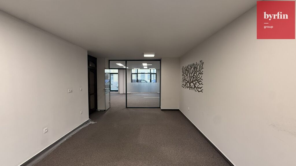 Prostor tvoří dvě samostatné místnosti oddělené skleněnou příčkou, které působí vzdušně a elegantně. K dispozici je také kuchyňka a sociální zázemí. Díky velkým výlohám do ulice se prostor hodí nejen jako kancelář, ale i jako showroom nebo obchodní jednotka. Navíc je možné využít výlohu pro vlastní reklamu.