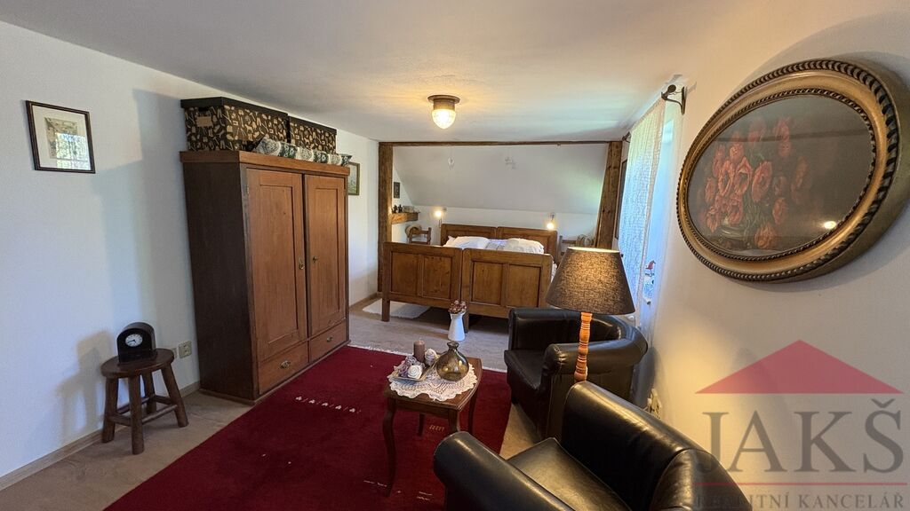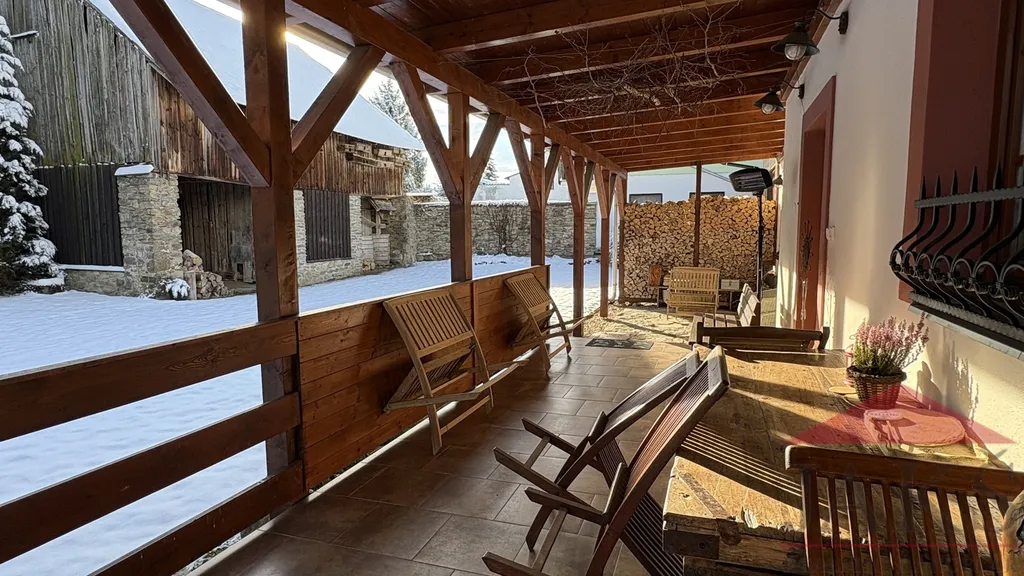 Popis: část. podsklep.; sklepy (elektrokotel a el. boiler) s klenbou; přízemí 169 m2: garáž, zastřešená veranda, chodba se schodištěm, koupelna (umyv., sprch. kout walk in, WC, pračka), kuchyň 34 m2 (kuch. linka s HV troubou, sklo-ker. deskou, myčkou, digestoří) se spíží a obytnou jídelnou (krbová kamna a zrestaurovaný stylový nábytek), prostorný obývací pokoj 50 m2 (krb, vstup na terasu; původní klenby z ručně vyrobených cihel), podkroví 143 m2: chodba (pracovní kout), koupelna (umyv., vana, WC, topný žebřík), 2x ložnice (buková podlaha), otevřený prostorný obývací pokoj 70 m2 s mezonetovým ležením, 2x komora (příprava pro kuch. linku; elektrokotel), koupelnou (umyv., sprcha, WC, topný žebřík) a ložnicí.