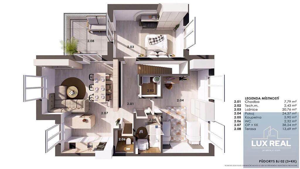 Byt č.2 je dispozičně řešen jako 4+kk o velikosti 102m2 s terasou 13,69m2 nacházející se v 2.NP. K bytu náleží 2 parkovací stání.