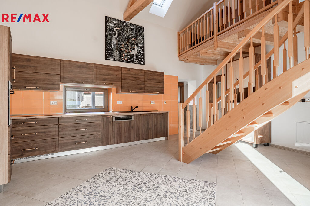 Dispozice obytné části (160 m²): předsíň, WC, koupelna, kuchyň, obývací pokoj, 2x dětský pokoj a ložnice. Dům se prodává částečně vybavený nábytkem na míru.