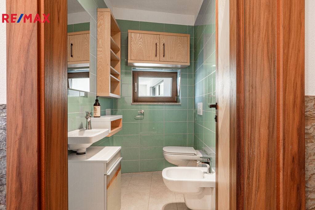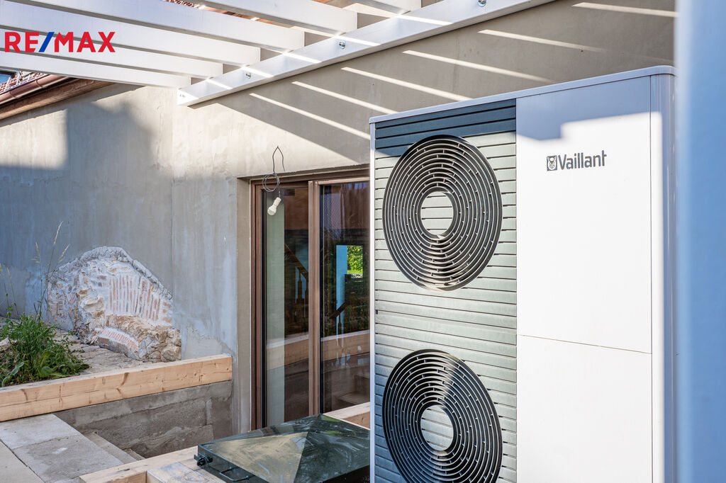 Vytápění a ohřev vody zajišťuje tepelné čerpadlo Vaillant + podlahové vytápění v celém domě (chybí pouze ložnice),