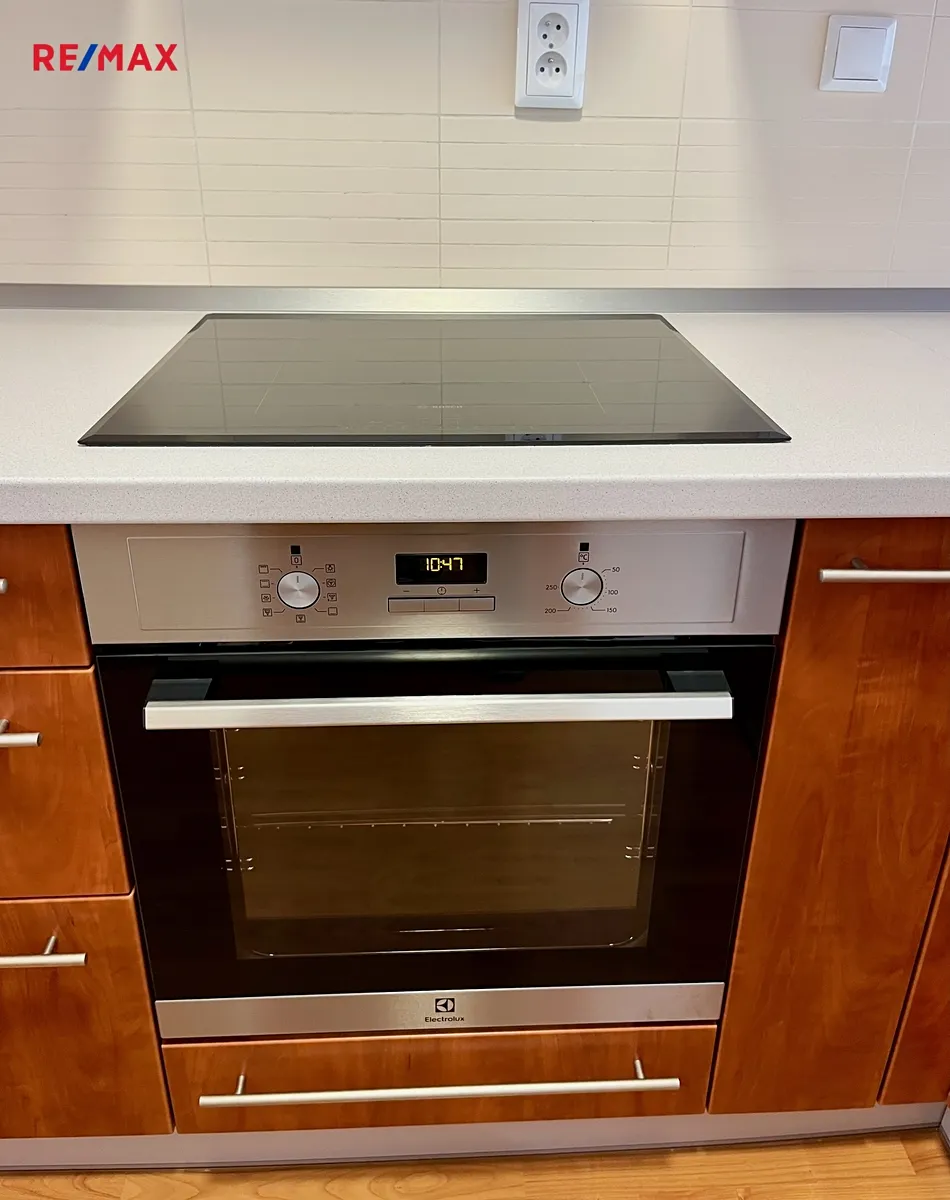 - Kuchyňská linka vybavená vestavěnými spotřebiči: trouba, varná deska, myčka, lednice s mrazákem