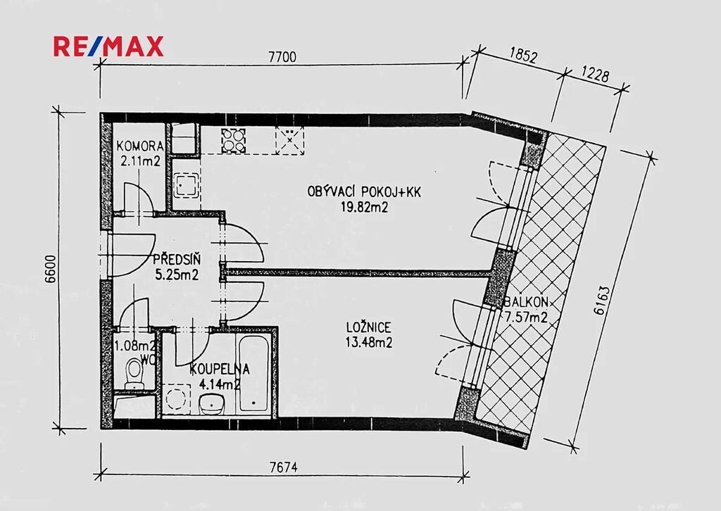 - Obývací pokoj s kuchyňským koutem (20 m²) a vstupem na balkon