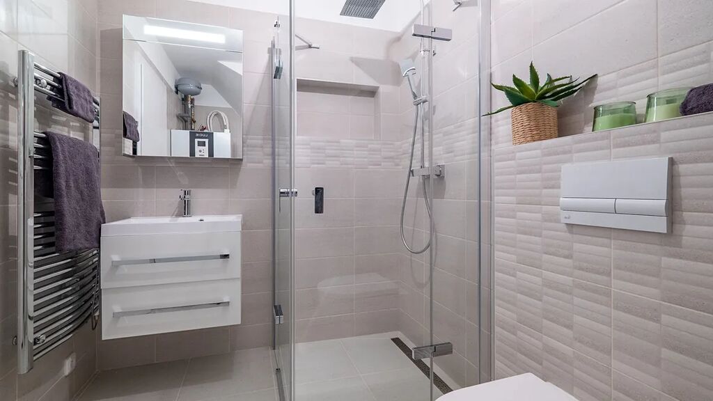Interiér domu tvoří prostorný obývací pokoj s moderní kuchyňskou linkou na míru vybavenou spotřebiči, čtyři samostatné pokoje, dvě koupelny, šatna, komora a praktická půda s dostatkem úložného prostoru.