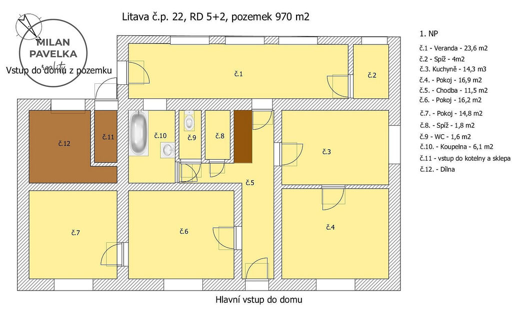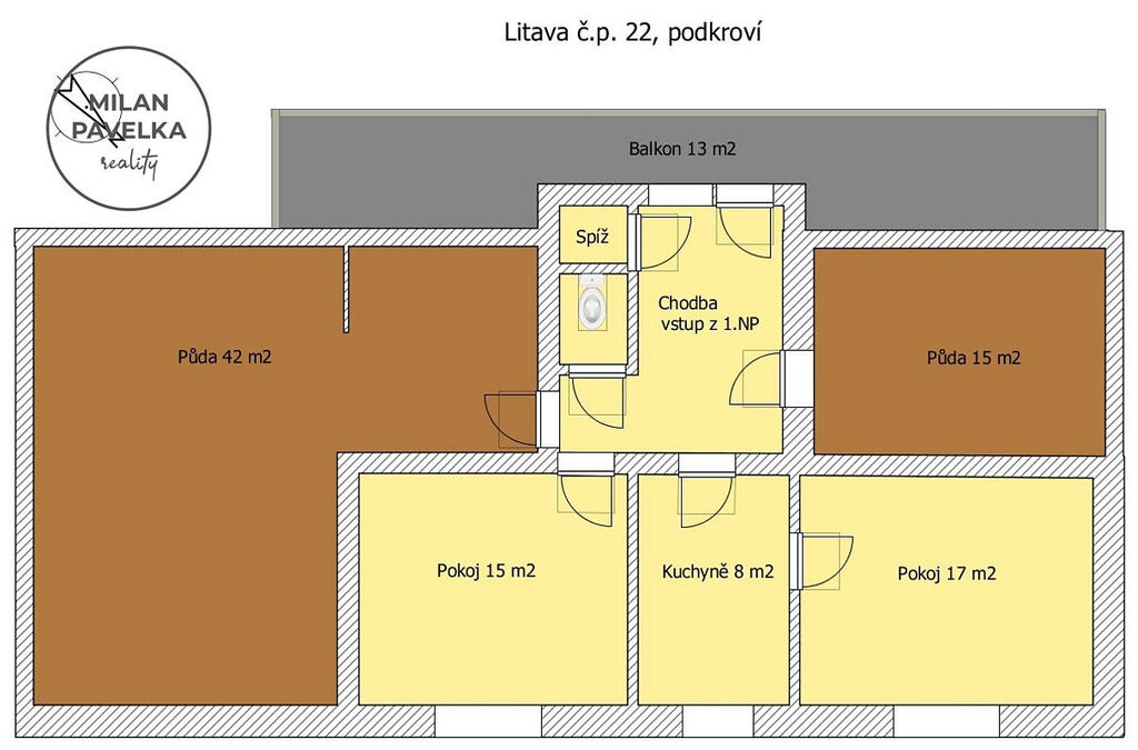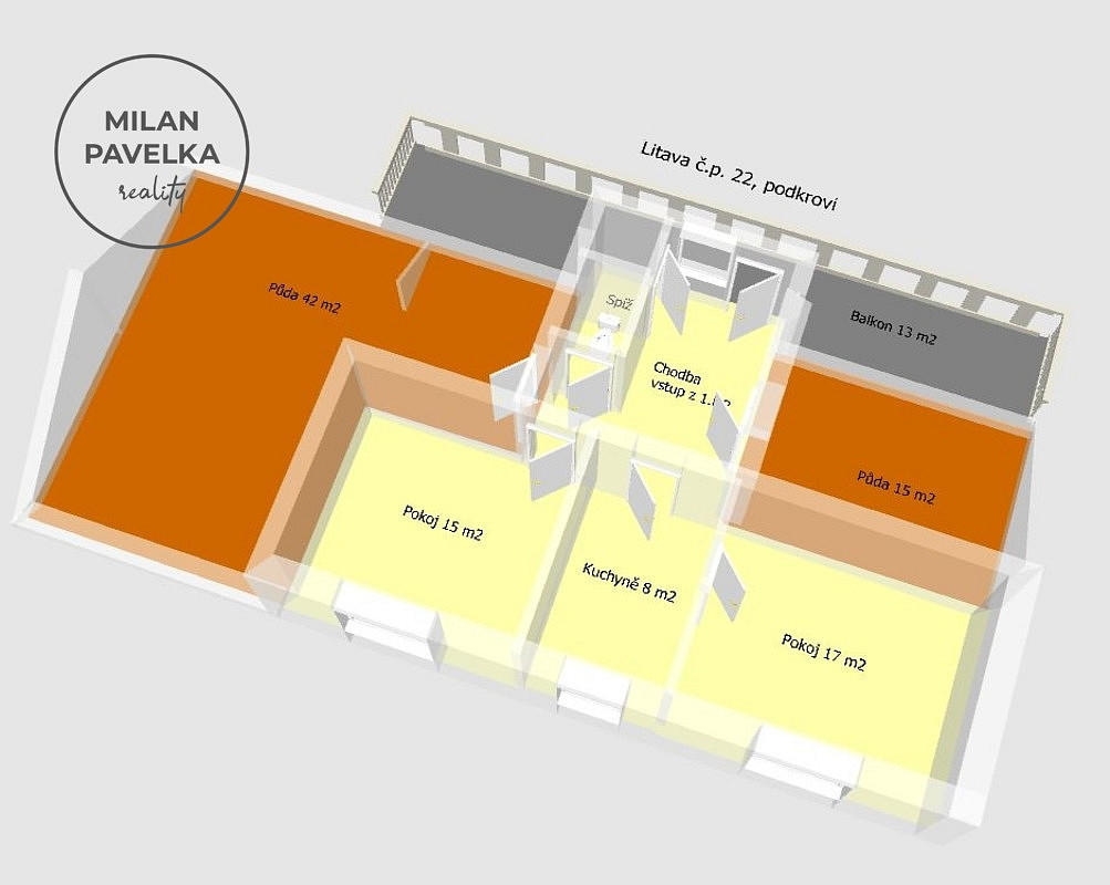 Vstup do domu - 1. NP: chodba, spíž, kuchyně, sociální zařízení, tři pokoje a schodiště do 2. NP. Zde jsou dva pokoje, kuchyně a velký půdní prostor. Pod střechou s pálenými taškami se nachází půdní prostor, který nabízí možnost vybudování zajímavého podkrovního pokoje.