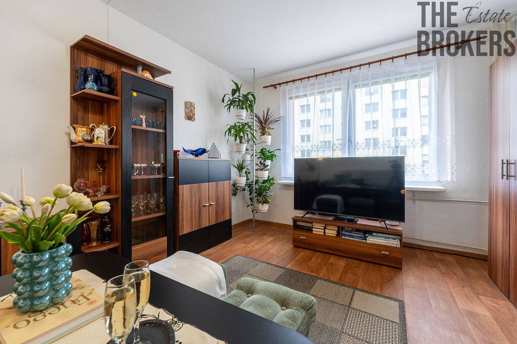 Samotný byt vás mile překvapí svou promyšlenou dispozicí. Hlavní obytná místnost slouží v současné době jako obývací pokoj i ložnice – útulné místo, kde můžete odpočívat po náročném dni a vychutnat si klid domova. Druhá místnost je řešena jako jídelna s kuchyňským koutem, což nabízí nejen prostor pro přípravu chutných pokrmů, ale i pohodlné stolování. Tento koncept zajišťuje, že byt působí vzdušně a přitom plně funkčně. K tomu se přidává balkon, ideální pro ranní kávu, odpolední čtení nebo posezení při západu slunce nebo jen sušení prádla. Sklep pak poskytne dostatek úložného prostoru pro sezónní věci či sportovní vybavení.