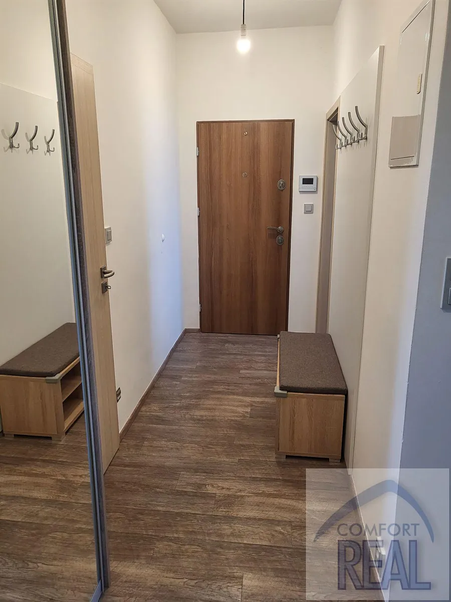Uvnitř najdete prostornou předsíň, která slouží jako centrální bod se samostatnými vstupy do všech místností - dvou pokojů, kuchyně, koupelny, toalety a užitečné komory.