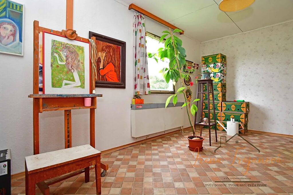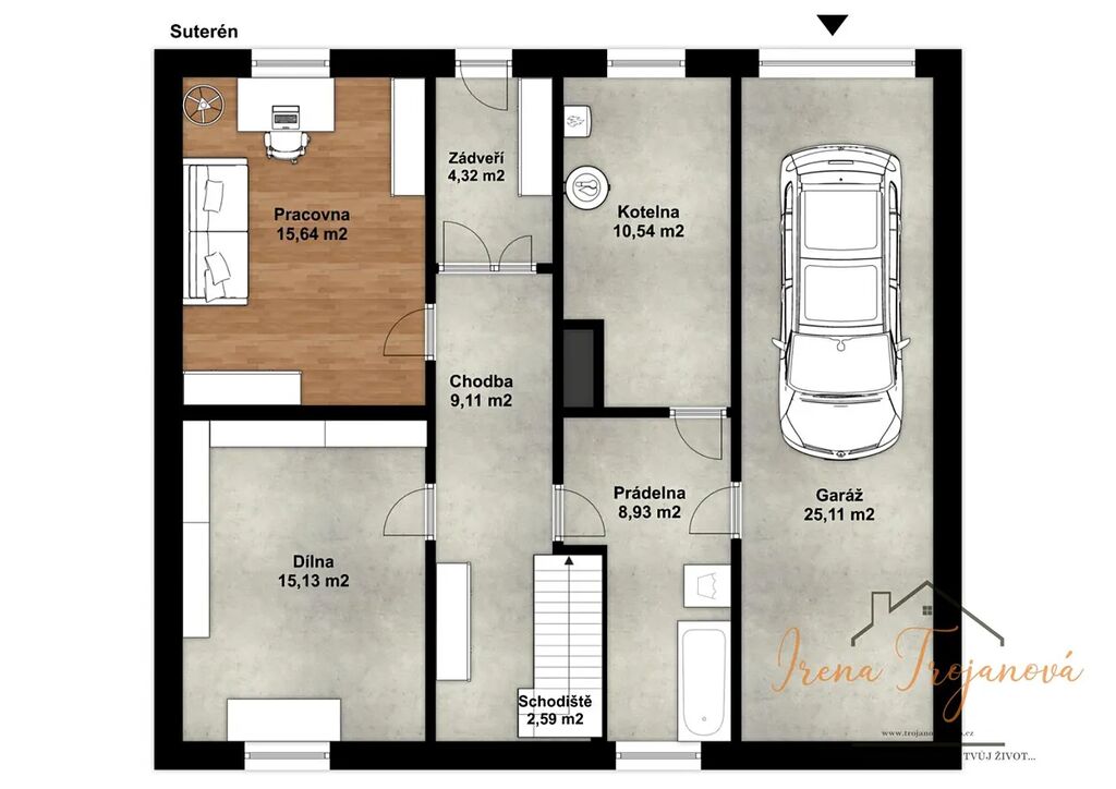 Suterén domu nabízí kromě garáže, dílny, kotelny a prádelny také prostornou pracovnu s krbem a přímým vstupem na zahradu. Tato část je ideální pro vybudování třetí samostatné bytové jednotky s vlastním vstupem.
