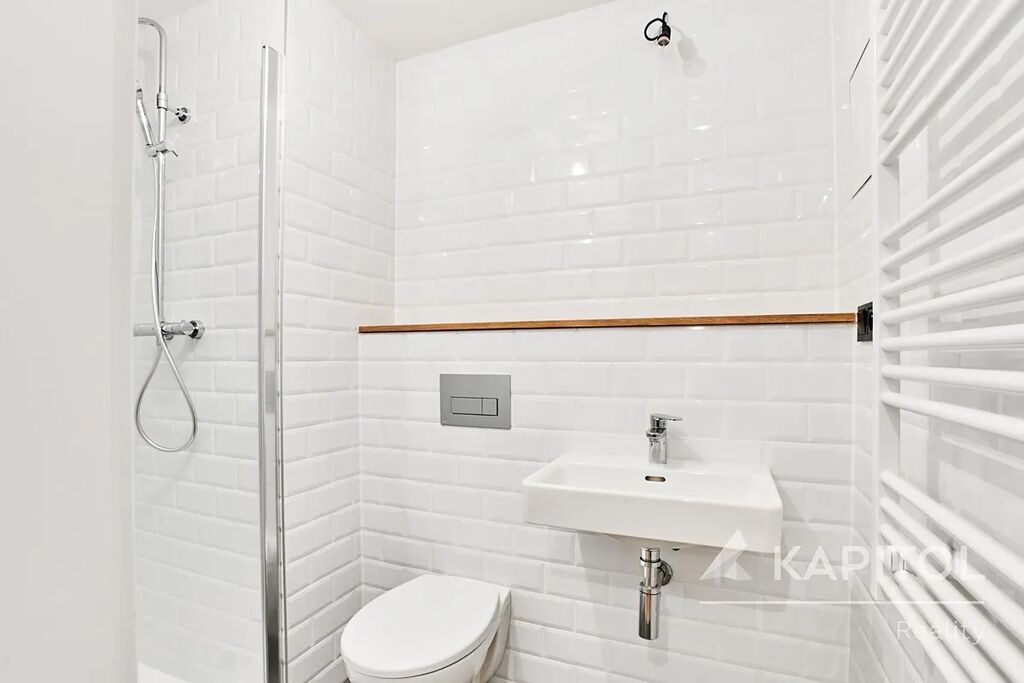 •Koupelna ve spodní části bytu: 2.33 m², vybavena sprchovým koutem, umyvadlem a WC