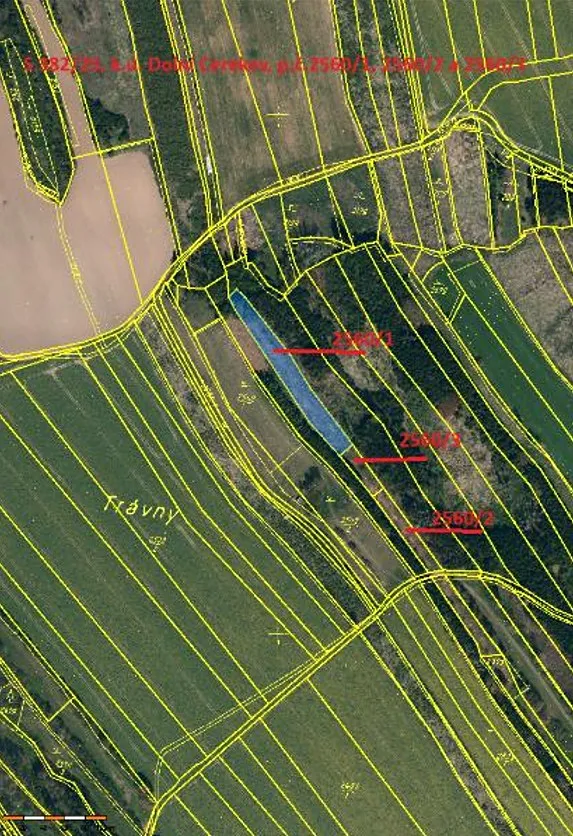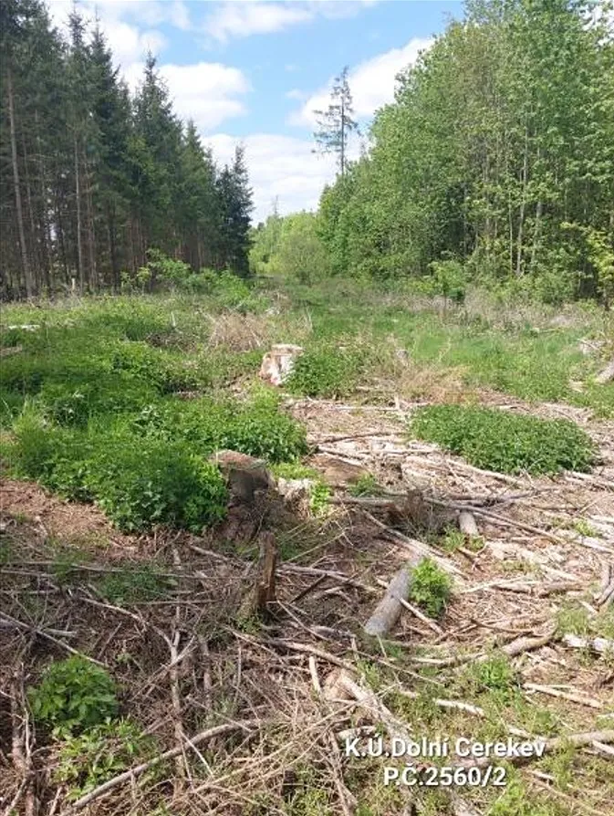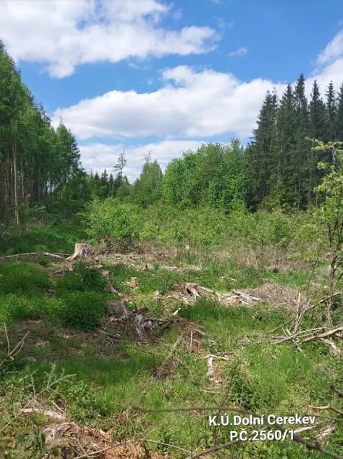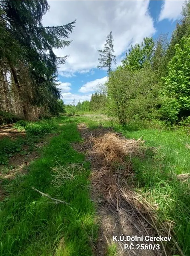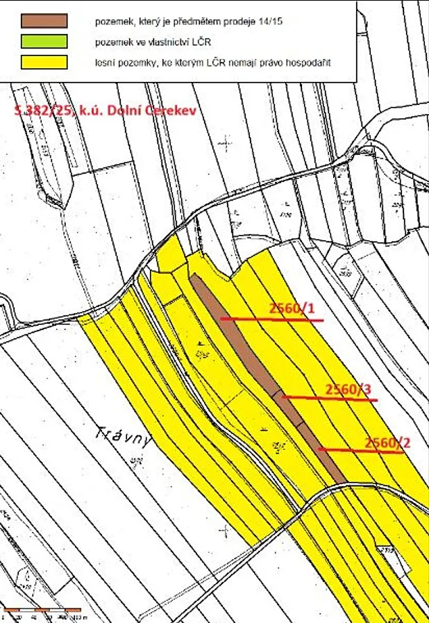 Jedná se o prodej podílu o velikosti Id. 14/15 k 3 lesním pozemkům parc. č. 2560/1 o celkové výměře 3377 m2, parc. č. 2560/2 o celkové výměře 1228 m2 a parc. č. 2560/3 o celkové výměře 761 m2, úzkého tvaru, obklopených pozemky jiných vlastníků. Porost na pozemcích byl vytěžen, zůstává jen na severním okraji pozemku parc. č. 2560/1 na cca 200 m2 porost břízy.