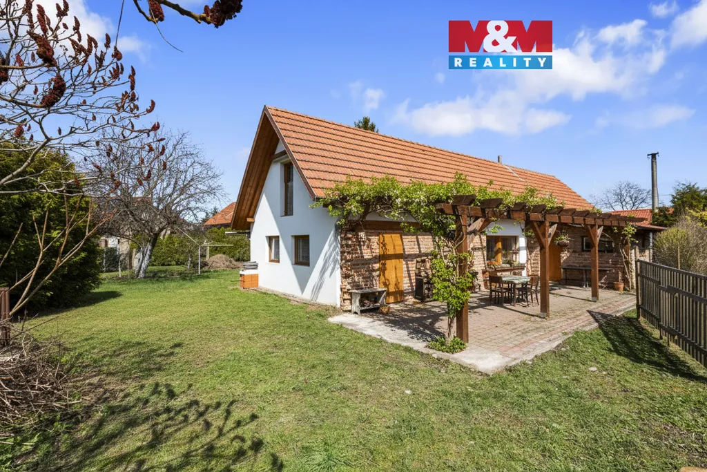 Dispozice domu: zděná veranda s koupelnou a WC, obývací pokoj s kuchyňským koutem, ložnice, v zadní části domu stodola a garáž upravená na obytnou místnost, venkovní pergola.