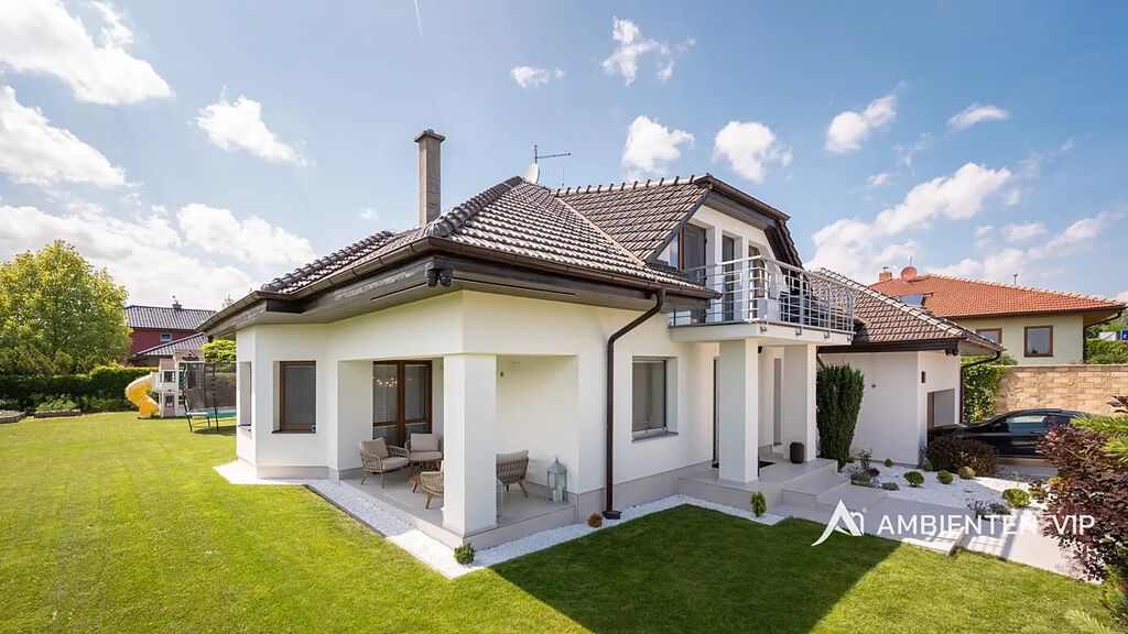 AMBIENTEN VIP si vám dovoluje exkluzivně nabídnout prodej luxusní třípodlažní vily o dispozici 6+kk se dvěma koupelnami, okrasnou zahradou, bazénem a garáží pro dva vozy v obci Moravany u Brna. Nemovitost prošla kompletní rozsáhlou rekonstrukcí a nevyžaduje žádné investice. Je v perfektně technickém stavu. Tato nemovitost uspokojí a velice náročné klienty. Celková užitná plocha domu činí 360 m² a CP pozemku činí 1188 m².