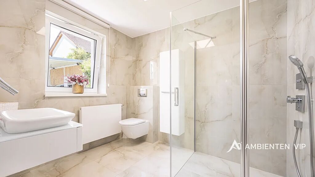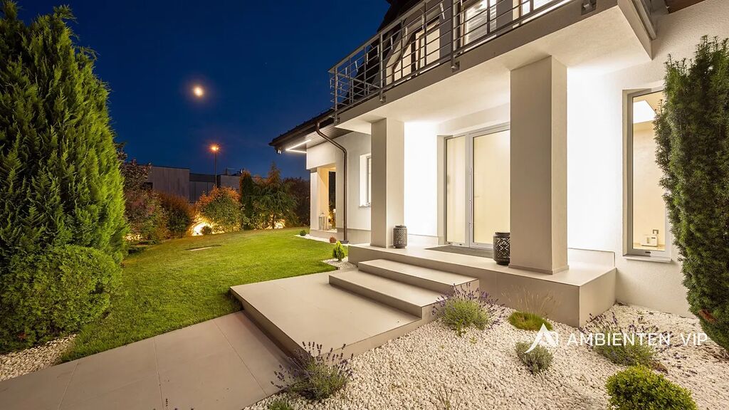 V přízemí vily se nachází honosná vstupní hala, která je vybavena vestavnými skříněmi na míru. Ze vstupní haly vstupujete do otevřené dispozice obývacího prostoru s luxusní jídelnou a nadstandardně vybavenou kuchyní. Kuchyňská linka je na míru vyrobena od firmy Vagunda a je vybavena moderními spotřebiči značky Siemens. Hlavní dominantou kuchyně je onyxový prvek s podsvícením, který slouží jako barový ostrůvek s vestavěnou vinotékou. Z kuchyně vede přímý vstup na zastřešenou terasu. Stěny obývacího prostoru a vstupní haly jsou provedeny speciální dekorační technikou benátský štuk, který dodává interiéru reprezentativnost a osobitost. Dále se zde nachází dětský pokoj, koupelna se sprchovým koutem a toaletou, technická místnost a garáž pro dva vozy. Technická místnost nyní slouží jako prádelna a nachází se zde plynový kotel. Z obývacího pokoje a chodby vedou dva přímé vstupy na venkovní terasu s posezením a na zahradu. Mezipatro domu disponuje luxusní nadstandardní ložnicí a samostatnou šatnou s velkým množstvím úložného prostoru. V druhém patře vily se nachází 3 samostatné pokoje a koupelna s vanou, sprchovým koutem, umyvadlem, toaletou a bidetem. Ze všech pokojů včetně koupelny vedou vstupy na balkon. Půdní prostor je pochozí a plně funkční k uložení dalších věcí.