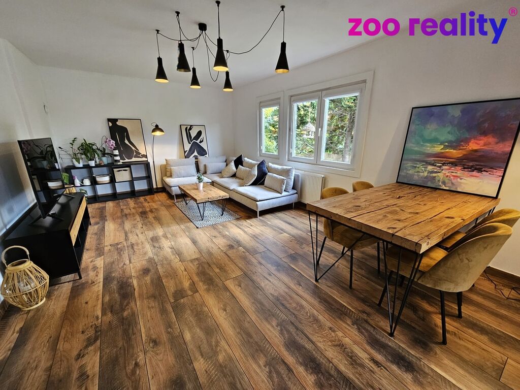 • Moderní vybavená kuchyně a světlý obývací pokoj s pohodlnou pohovkou, televizí a velkým jídelním stolem.