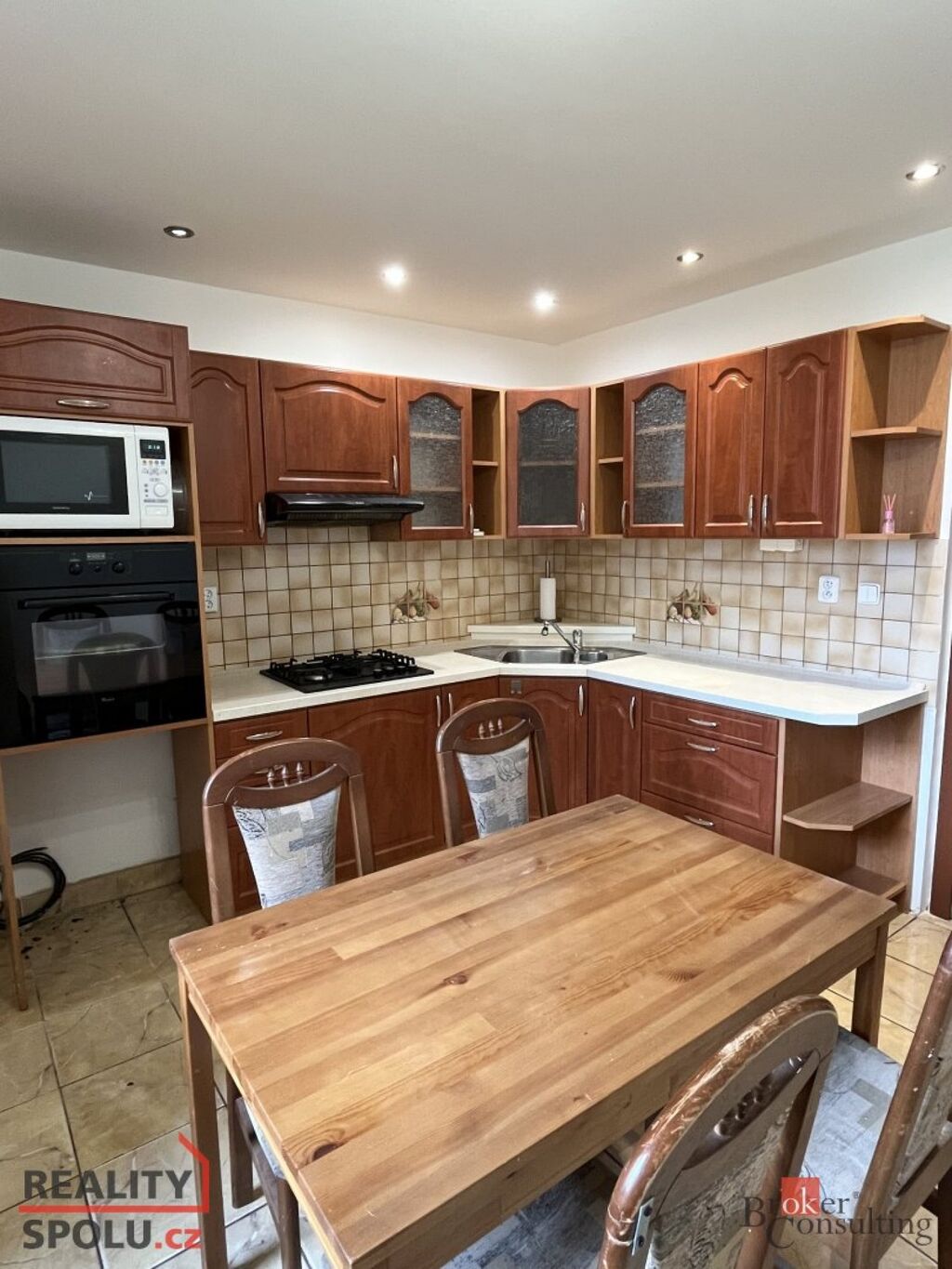 Součástí vybavení je kuchyňská linka s plynovým sporákem, troubou, digestoří, mikrovlnnou troubou a jídelním setem. V obývacím pokoji zůstává obývací stěna.