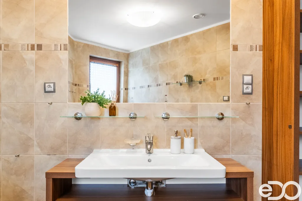 Dům je z roku 2009, je vidět, že o něj bylo dobře postaráno. Je částečně vybavený nábytkem, kuchyňská linka má všechny vestavěné elektrospotřebiče včetně lednice s mrazákem. Plastová okna s vnitřními žaluziemi a elektricky ovládanými venkovními roletami a částečně s manuálními roletami. Na podlahách je plovoucí podlaha a dlažba, vytápění je řešeno podlahovým topením a radiátory napojenými na elektrokotel. K tomu je v domě krbová vložka s výměníkem a rozvodem tepla do všech místností, ohřev vody zajišťuje bojler. Dispozice nabídne prostorný obývací pokoj s krbem propojený s kuchyní a jídelnou, ložnici, dva dětské pokoje, pracovnu, šatnu, koupelnu s vanou i sprchou, samostatné WC, technickou místnost a přímý vstup z dvojgaráže.