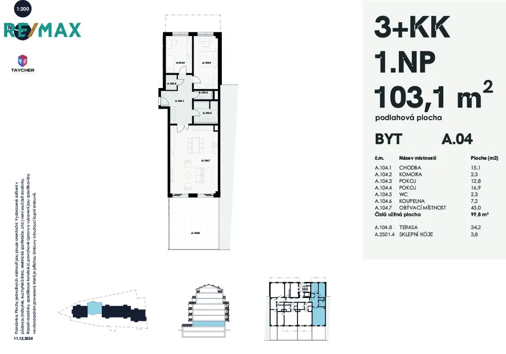 K bytu patří terasa 34,2 m², která přímo vybízí k ranní kávě i večernímu posezení, a sklepní kóje 3,8 m².
