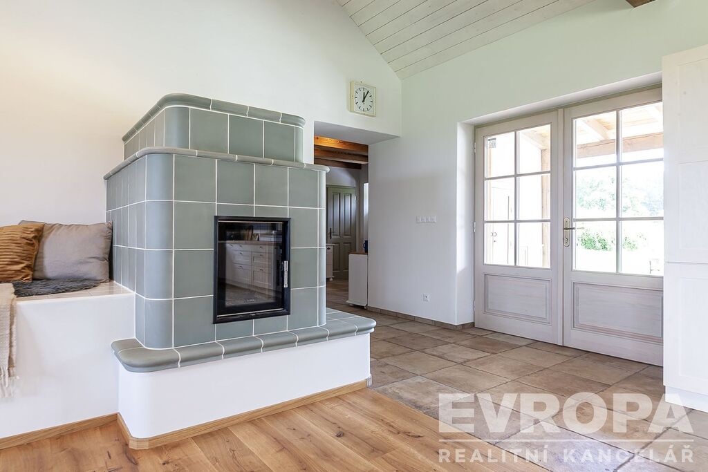 • Přízemí: velkorysý obytný prostor s kuchyní, jídelnou a obývákem, kde centrem dění jsou kachlová kamna s lavicí na ležení a akumulací tepla na celý den. Z obývacího pokoje vyjdete přímo na slunnou terasu, odkud si můžete vychutnat rána v naprostém tichu. Dále prostorná koupelna a dva pokoje.