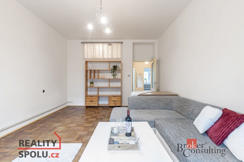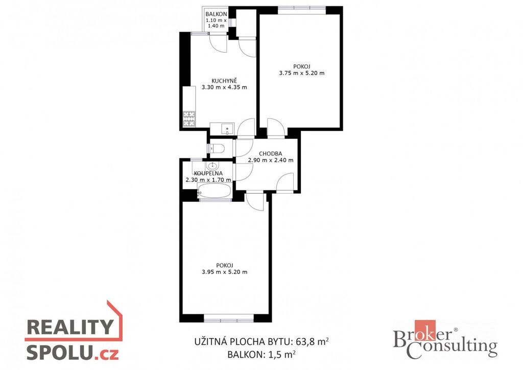 Byt je v osobním vlastnictví a jeho dispozici tvoří dva velké, světlé pokoje (oba o výměře cca 20 m²), samostatná kuchyně (cca 14 m²), koupelna (4 m²) a prostorná předsíň. K bytu náleží také balkon (cca 1 m²) a sklepní prostor (cca 2 m²). Uvedené metry jsou orientační.