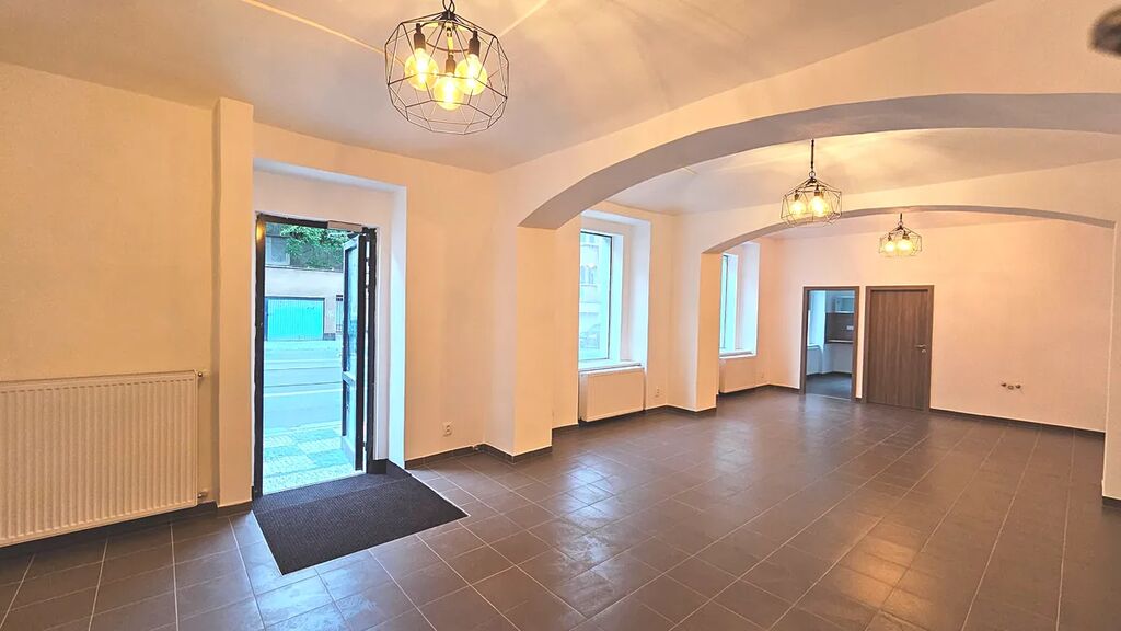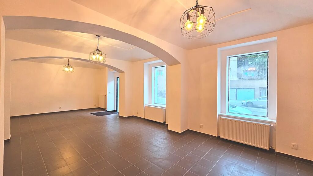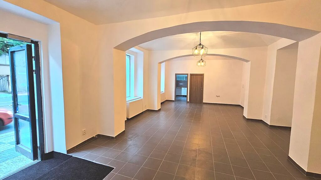 Obchodní prostor má krásný klenutý strop, okna do ulice a téměř bezbariérový vstup (15x3m, strop cca 3,2m). Před vstupem je široký dlážděný chodník.
