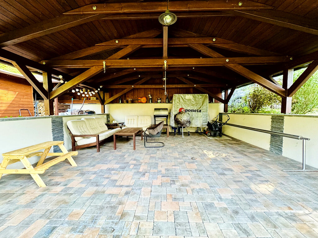 Přístřešek pro 2 auta, může sloužit jako prostorná pergola pro velká rodinná posezení.