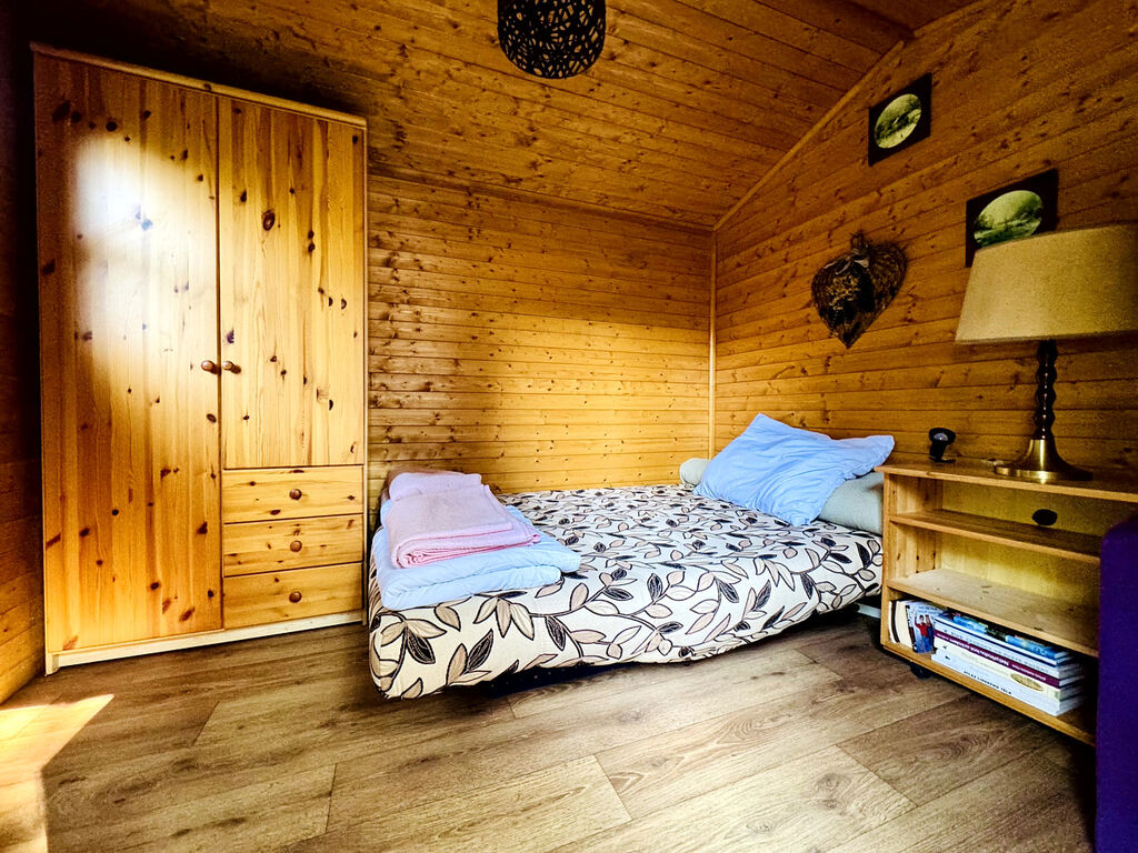 Vytápění zajišťují krbová kamna chytře umístěná v centru obytné části – teplo se rozlije po celé chatě.