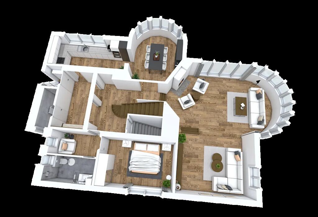 V přízemí je dominantou členitý obývací pokoj s krbem o rozloze 51,3 m2 a prostorem, který lze využít pro kulečník, domácí kino, nebo chillout zónu. Nabízí se i možnost ho příčkou rozdělit a vytvořit další místnost.