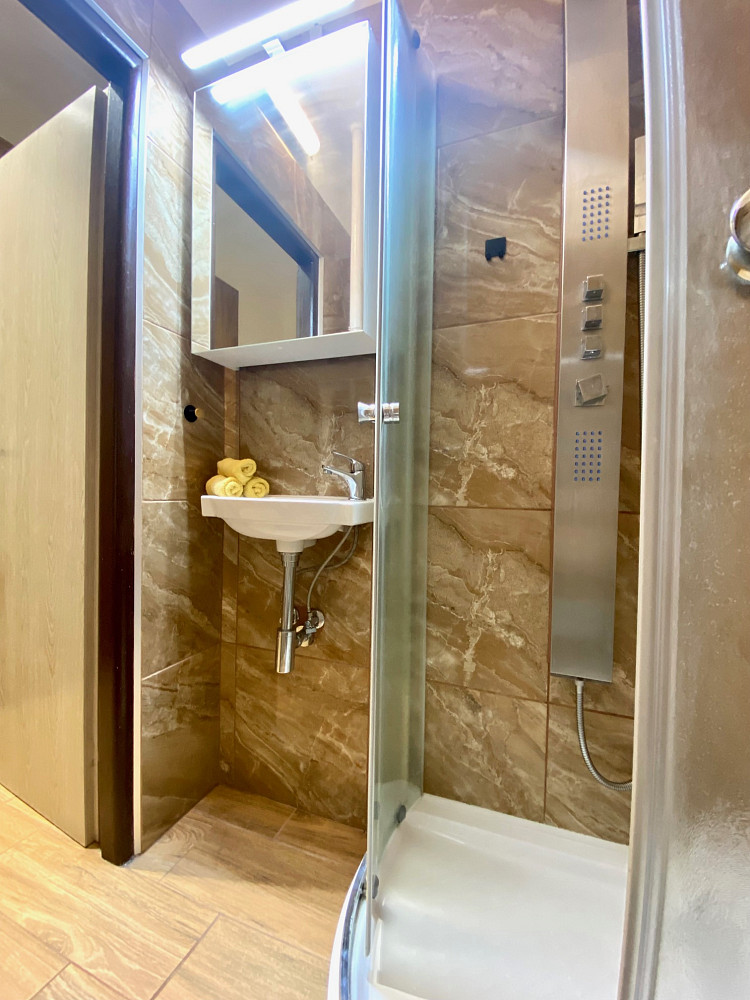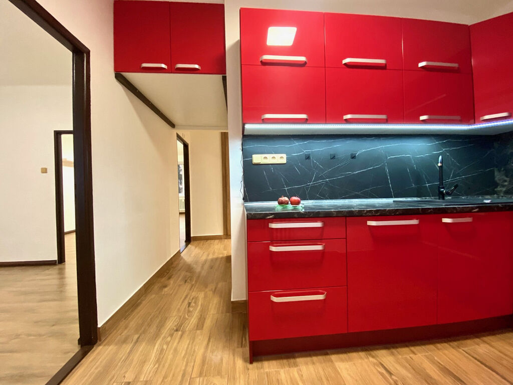 Byt po celkové rekonstrukci je dispozičně, velice prakticky řešen. Prostorná vstupní část nabízí dostatek úložného prostoru v podobě vestavěné skříně, zabudované po celé pravé části chodby. Bytová jednotka sestává ze dvou samostatných pokojů a krásné kuchyně, která působí svým designem nadčasově. Koupelna disponuje umyvadlem a nadstandardním sprchovým koutem. WC je samostatné.