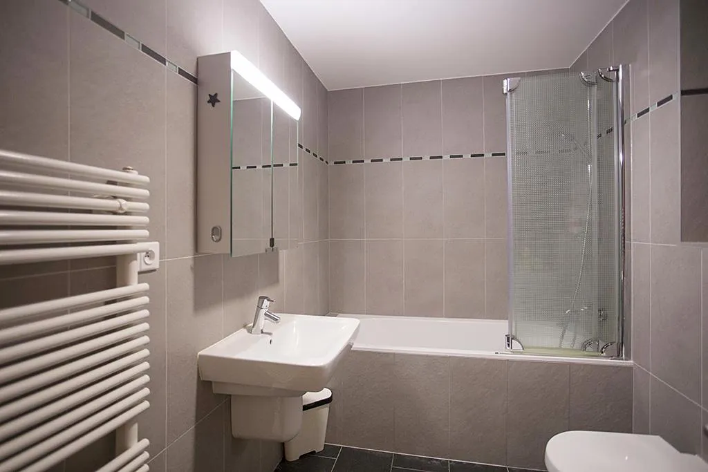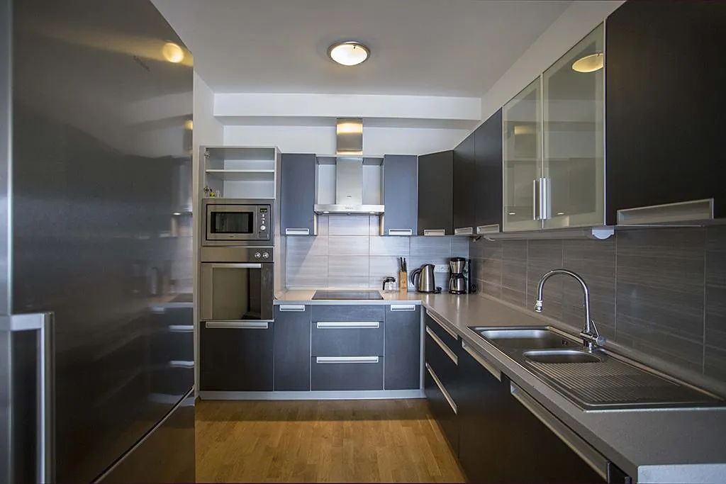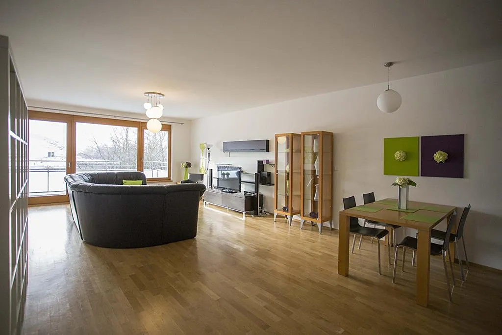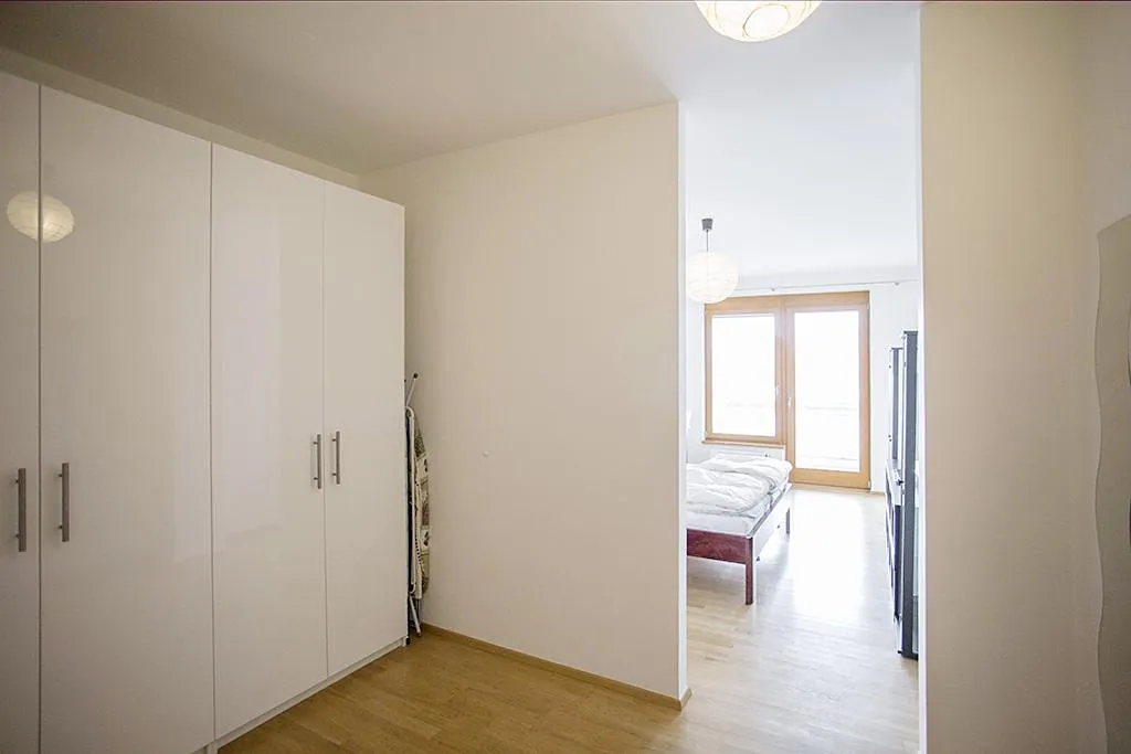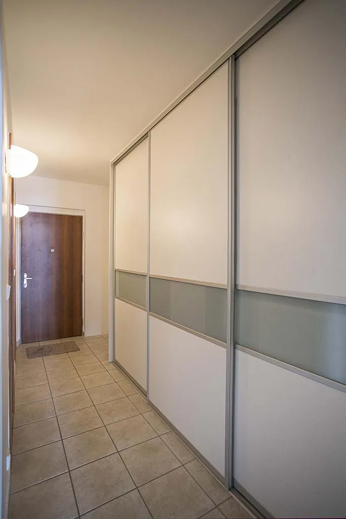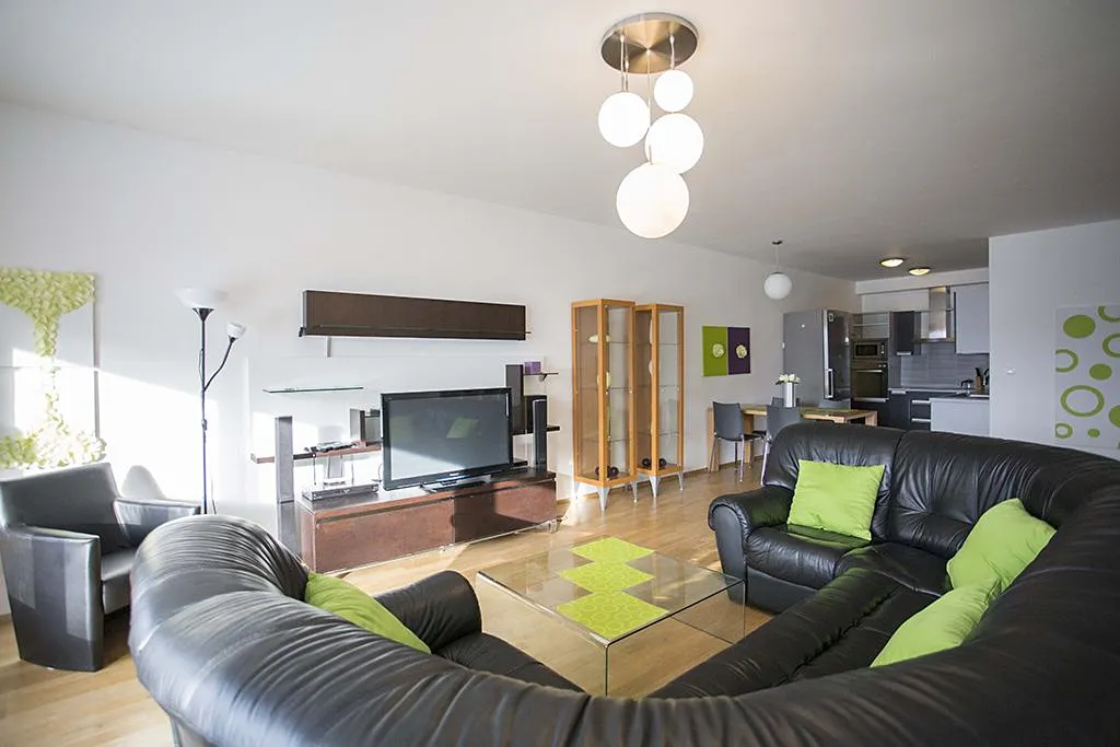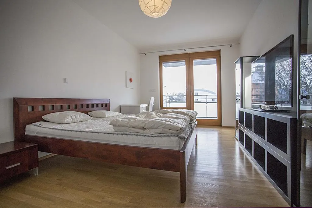 Dispozice: obývací pokoj s kuchyňským koutem vybaveným spotřebiči, ložnice, předsíň, koupelna s vanou, toaleta, terasa. K jednotce náleží rovněž garážové parkovací stání v suterénu budovy. Byt je vybaven podobně jako na fotografiích.
