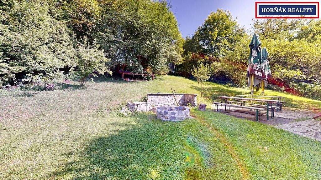 Venkovní prostor tvoří rozlehlá zahrada vybízející k odpočinku i zábavě se spoustou malebných zákoutí. Kryté posezení s grilem, ohniště, dětské hřiště s trampolínou a pískovištěm. V horní části zahrady pak stojí menší přístřešek.