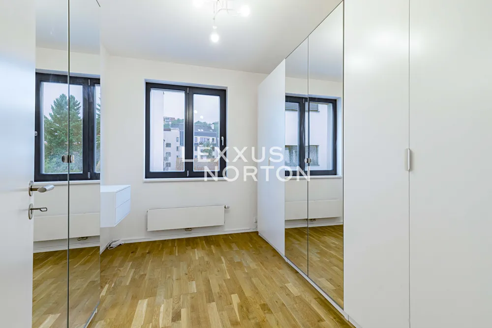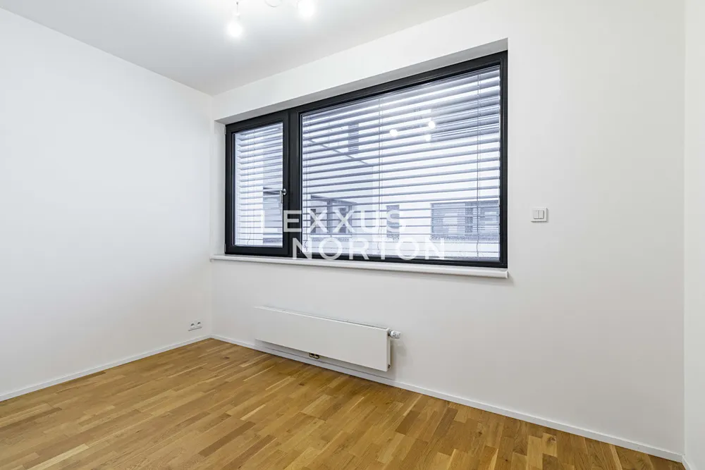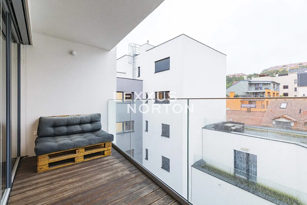 Byt disponuje vstupní chodbou, prostorným obývacím pokojem s plně vybaveným kuchyňským koutem (lednice, mrazák, mikrovlnná trouba, indukce, trouba, myčka nádobí) s jídelní částí a přímým vstupem na balkón a lodžii, 2 ložnice, přičemž jedna z nich má svou vlastní šatnu a přímý vstup na balkón. Dále disponuje pracovnou, koupelnou (vana a toaleta) a samostatnou toaletou. K bytu náleží sklep a garážové stání v ceně nájmu. Možnost pronájmu dalšího garážového stání za příplatek 2.000 Kč.