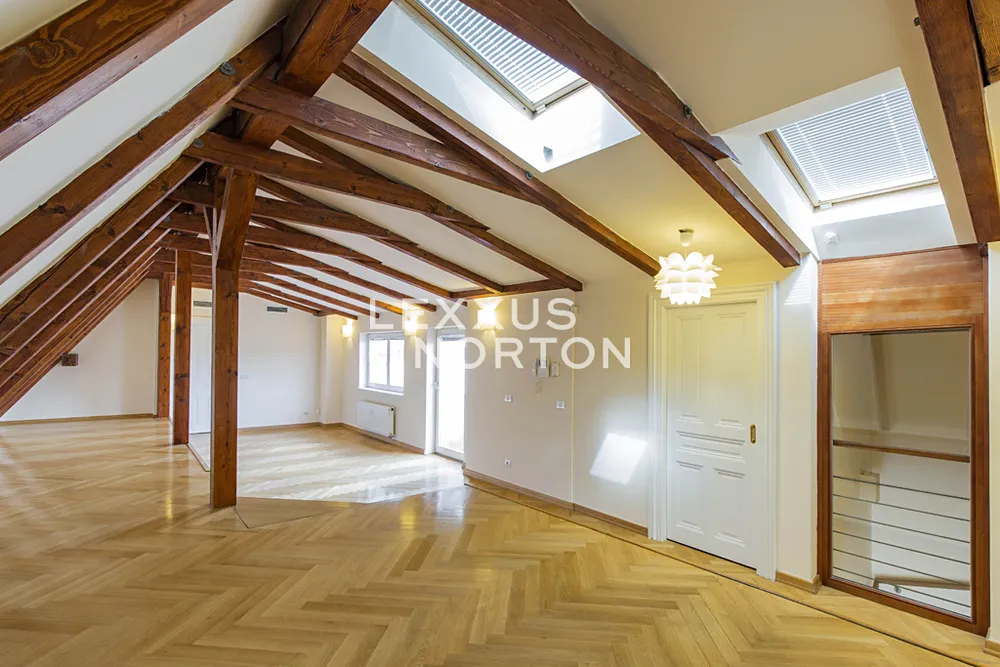 Tento světlý nezařízený byt k pronájmu nabízí ve spodním patře vstupní chodbu, prostorný obývací pokoj, plně zařízenou kuchyň (sklokeramická deska, trouba, lednice, mrazák, myčka nádobí a mikrovlnná trouba), ložnici se vstupem na balkon, s vlastní šatnou a koupelnou (sprchový kout, vana, toaleta, bidet), 2 ložnice také se vstupem na balkon, koupelnu (vana, toaleta, bidet), šatnu a komoru. V patře se nachází galerie, kterou lze využít jako další ložnici nebo společenskou místnost, koupelnu (sprchový kout, toaleta, bidet), prádelna (pračka a sušička) a terasa o velikosti 35 m2, která nabízí krásný výhled na Pražský hrad a Petřín. Budova je po kompletní rekonstrukci a nabízí služby recepce (od 8:00 do 21:00). K dispozici je také sklep a možnost pronájmu garážového parkovacího stání v zakladači za extra měsíční poplatek 3 900 Kč + DPH.