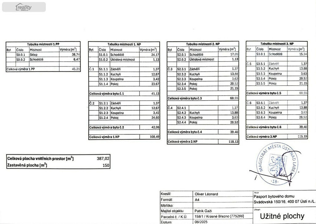 Výměry: 1. PP- 45,21m², 1. NP -108,49 m², 2. NP - 118,13m², 3. NP - 115,19m²