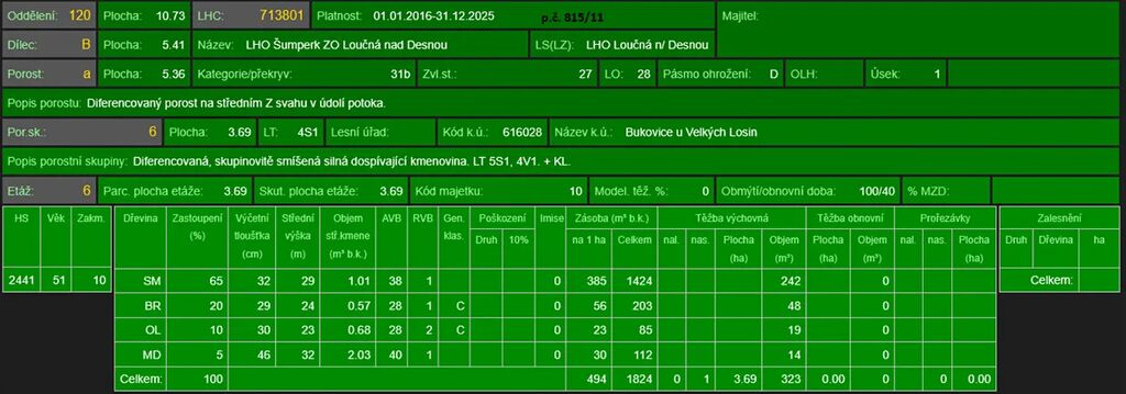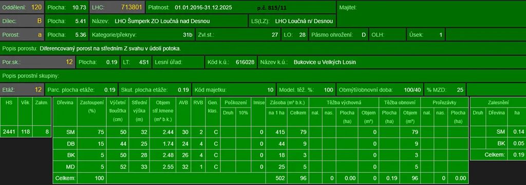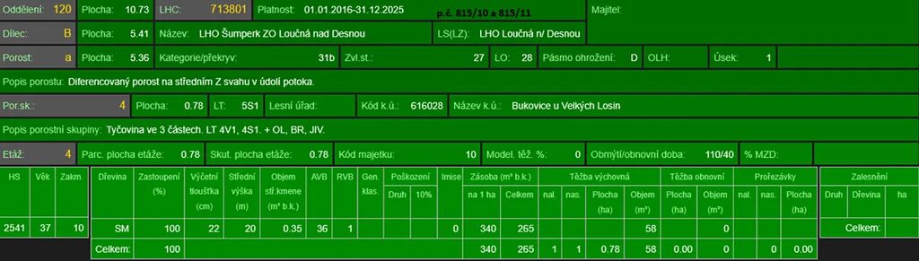 - p.č. 815/11 vedená jako lesní pozemek o celkové výměře 50 314 m2 (stáří lesa 127 – zastoupení dřevin smrk, dub, buk, modřín, stáří lesa 100 let - zastoupení dřevin smrk, javor, lípa, bříza, topol, stáří lesa 60 let – zastoupení dřevin smrk, borovice, olše, modřín, stáří lesa 46 – zastoupení dřevin smrk)