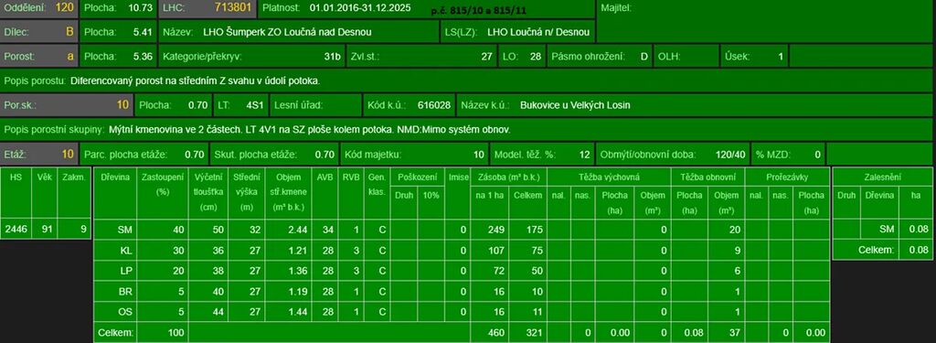 - p.č. 815/10 vedená jako lesní pozemek o celkové výměře 3 261 m2 (stáří lesa 100 let - zastoupení dřevin smrk, javor, lípa, bříza, topol a stáří lesa 46 let - smrk)