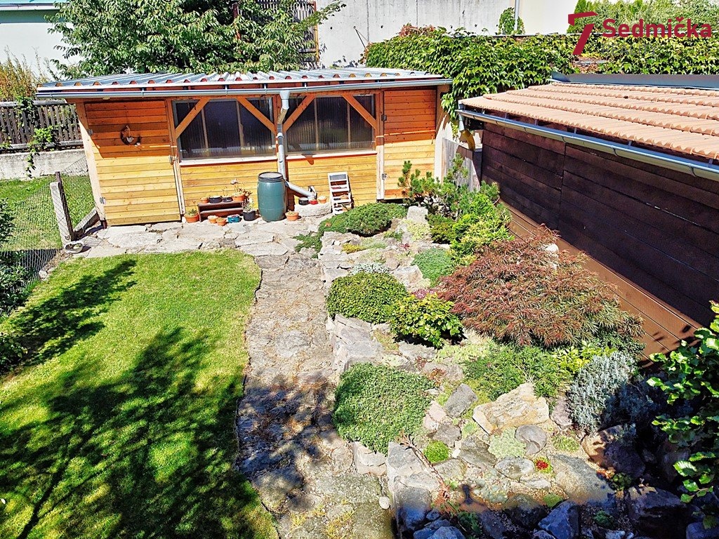 K bytu patří sklep, 1/3 společného sklepa, zahrada s dřevníkem, 2 parkovací místa, pergola s elektřinou, vodou, odpadem a kamny, majitel může navíc využívat 2 horní podesty na schodišti.