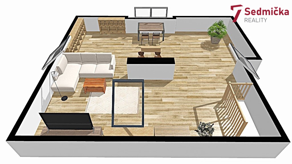 Byt je v 3. NP bytového domu se třemi byty. Má prostornou předsíň, kuchyň s jídelním koutem, dva pokoje, balkón, koupelnu s WC a v podkroví je velká jednoprostorová místnost.