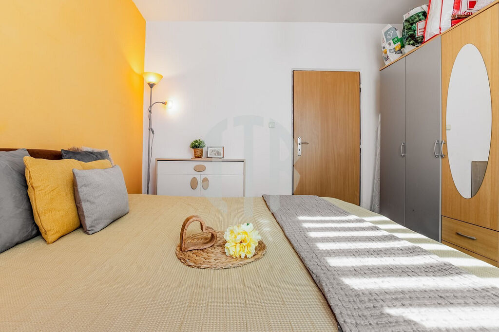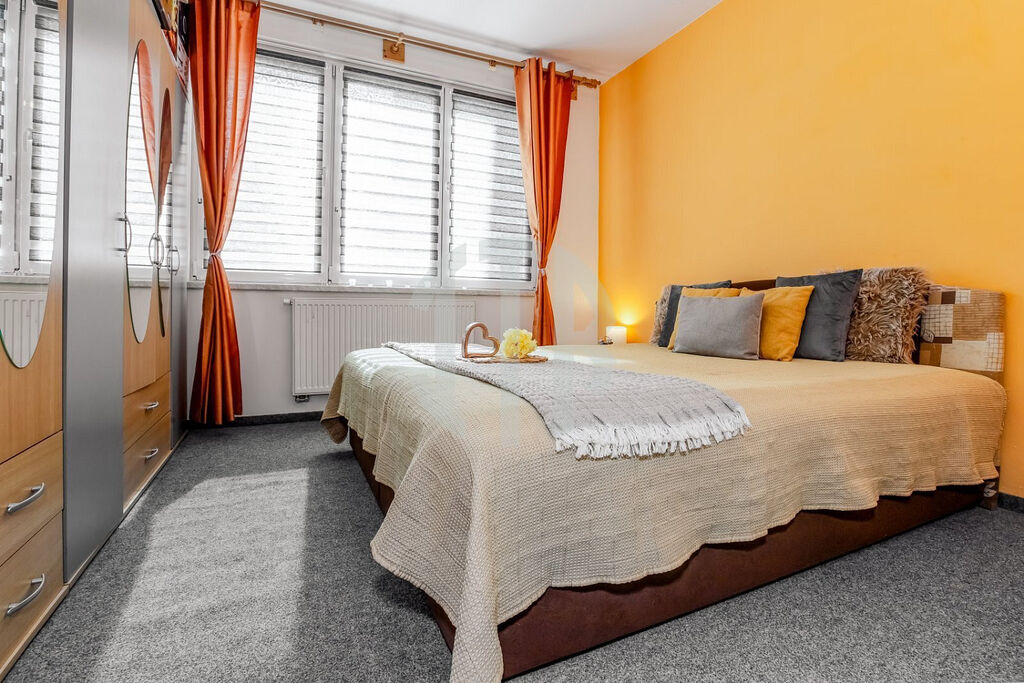 Dispozice bytové jednotky: hlavní vstup do bytu se zádveřím a vestavěnými skříněmi, samostatná kuchyně s jídelnou opatřená kuchyňskou linkou, koupelna se sprchovým koutem, umyvadlem a pračkou, samostatné WC, dětský pokoj, hlavní obývací pokoj s francouzským oknem a ložnice. K bytu náleží sklepní kóje v suterénu bytového domu, možnost parkování osobního automobilu přímo před domem.