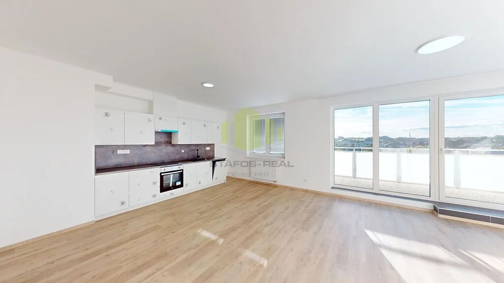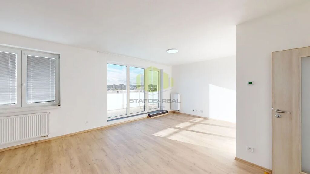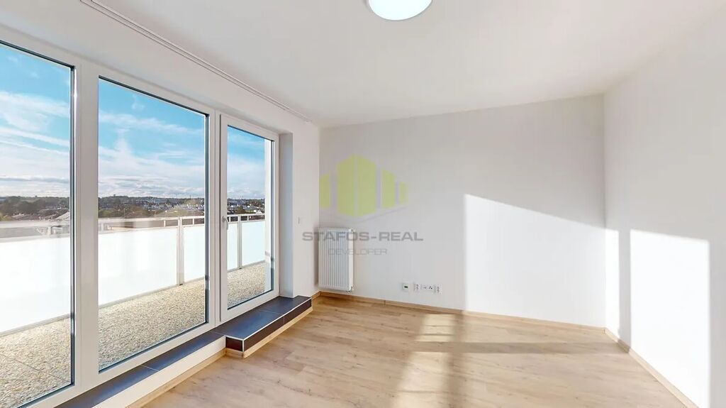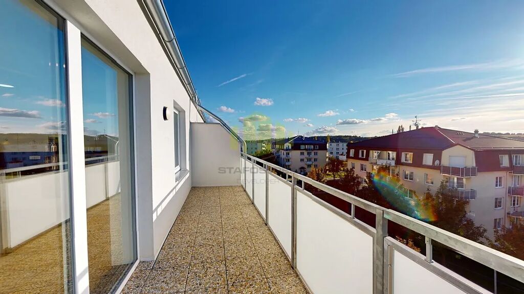 Nabízíme Vám byt 3+kk o ploše 92m2, který je korunován prostornou terasou o rozloze 24m2. Prostor je promyšleně rozdělen na obývací pokoj s moderně vybaveným kuchyňským koutem, přímosousedící ložnici, přičemž z obou místností je vstup na terasu, dále druhou samostatnou ložnici orientovanou na severní stranu s výhledem na město, vstupní halu, šatnu, koupelnu a samostatné WC. Vybavení kuchyňské linky zahrnuje indukční desku, troubu, myčku na nádobí a lednici s mrazákem. V koupelně naleznete vanu, umyvadlo, otopný žebřík a přípravu pro pračku.