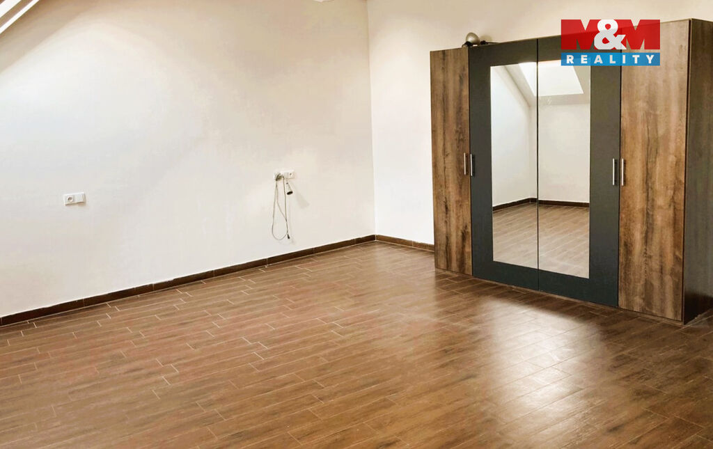 Druhý pokoj je vybaven šatní skříní se zrcadlem a může sloužit jako obývací pokoj, pracovna.