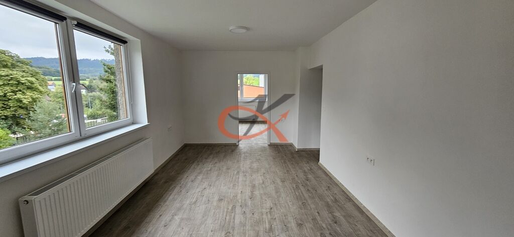 Dispozice: byt ve 2.p domu, vstup do předsíně (s prostornou vestavěnou skříní), ze které je vstup do koupelny s rohovou vanou, samostatné WC, vstup do kuchyně s novými spotřebiči (trouba, varná deska, myčka, zabudovaná mikrovlnná trouba) a vstupem do prostorné komory s oknem. Dále je vstup do prostorného obývacího pokoje, který si zařídí nájemníci dle svých preferencí. Samostatné vstupy do 2 pokojů. Byt je prostorný, vzdušný, dobře dispozičně řešený. Okolo domu možnost zahrádky a bezproblémové parkování. K dispozici prostorný sklep.