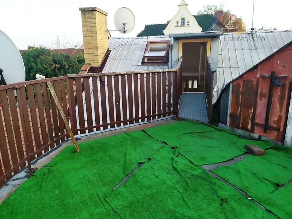 K technickým informacím – samotný byt má výměru 30m2, je z něj přímý přístup na střešní terasu 12m2, dále je k užívání uzavřený zatravněný dvůr domu, který je společný pro všech 7 bytů . Tento byt je vybudovaný z půdního prostoru před třinácti lety, takže není potřeba zásadní rekonstrukce. To byly totiž zavedeny nové rozvody všech instalací, montovaná dřevěná střešní okna s roletami a provedeno zateplení. Vytápění je zde řešeno vlastním plynovým kotlem. Nachází se ve třetím podlaží bez výtahu.