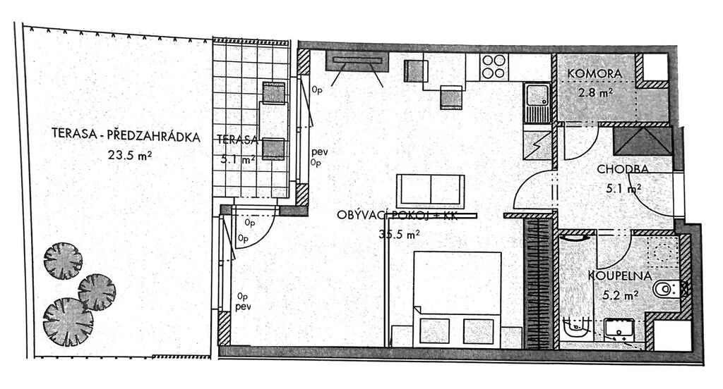 Nová nabídka – krásný a prostorný byt 2+kk s vlastním garážovým stáním, sklepem a hlavně luxusně velkou TERASOU/ZAHRÁDKOU. Byt je obýván teprve 2 roky a je ještě v záruce od developera!